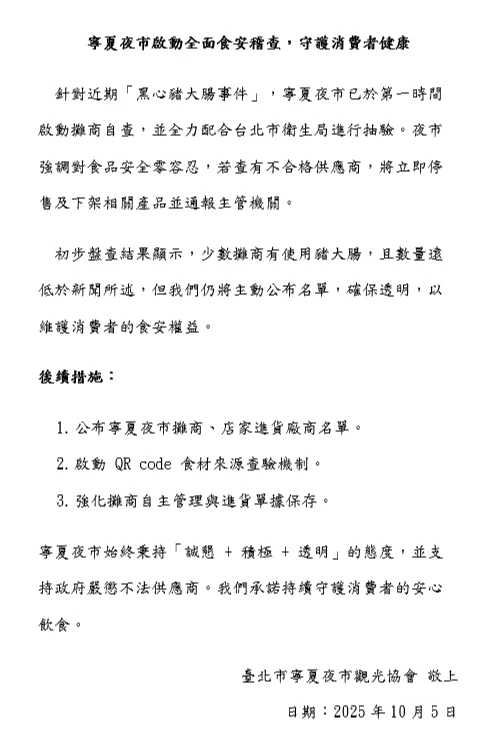 下午寧夏觀光夜市協會理事長林定偉受訪表示,初步了解有使用豬腸的攤商約5~10攤,第一時間啟動攤商自查,請他們提供豬腸合格證明、檢驗報告或是來源證明,因為今天假日所以攤商還沒有全部回報,目前尚未有使用百威產品的回報,協會會全力配合台北市衛生局抽驗,查有不合格的供應商,停售並且下架,會主動公布名單。