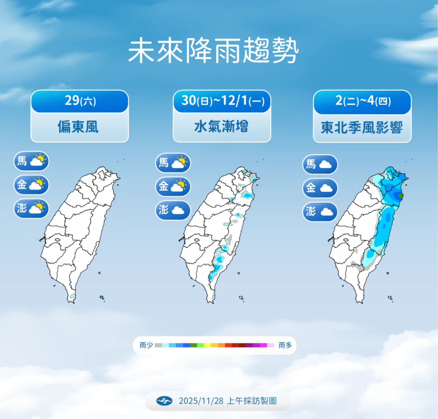 好天氣將暫告一段落。黃恩鴻預報員指出,下一波東北季風將於12月2日增強,屆時北台灣氣溫將明顯轉涼,其他地區早晚也會有涼意。迎風面地區的桃園以北、東半部、恆春半島這3個地區將轉為有局部短暫雨,其他地區則為多雲到晴。