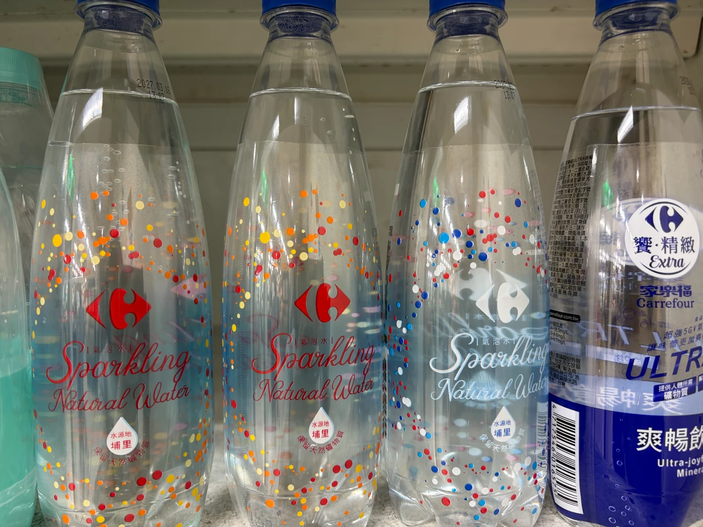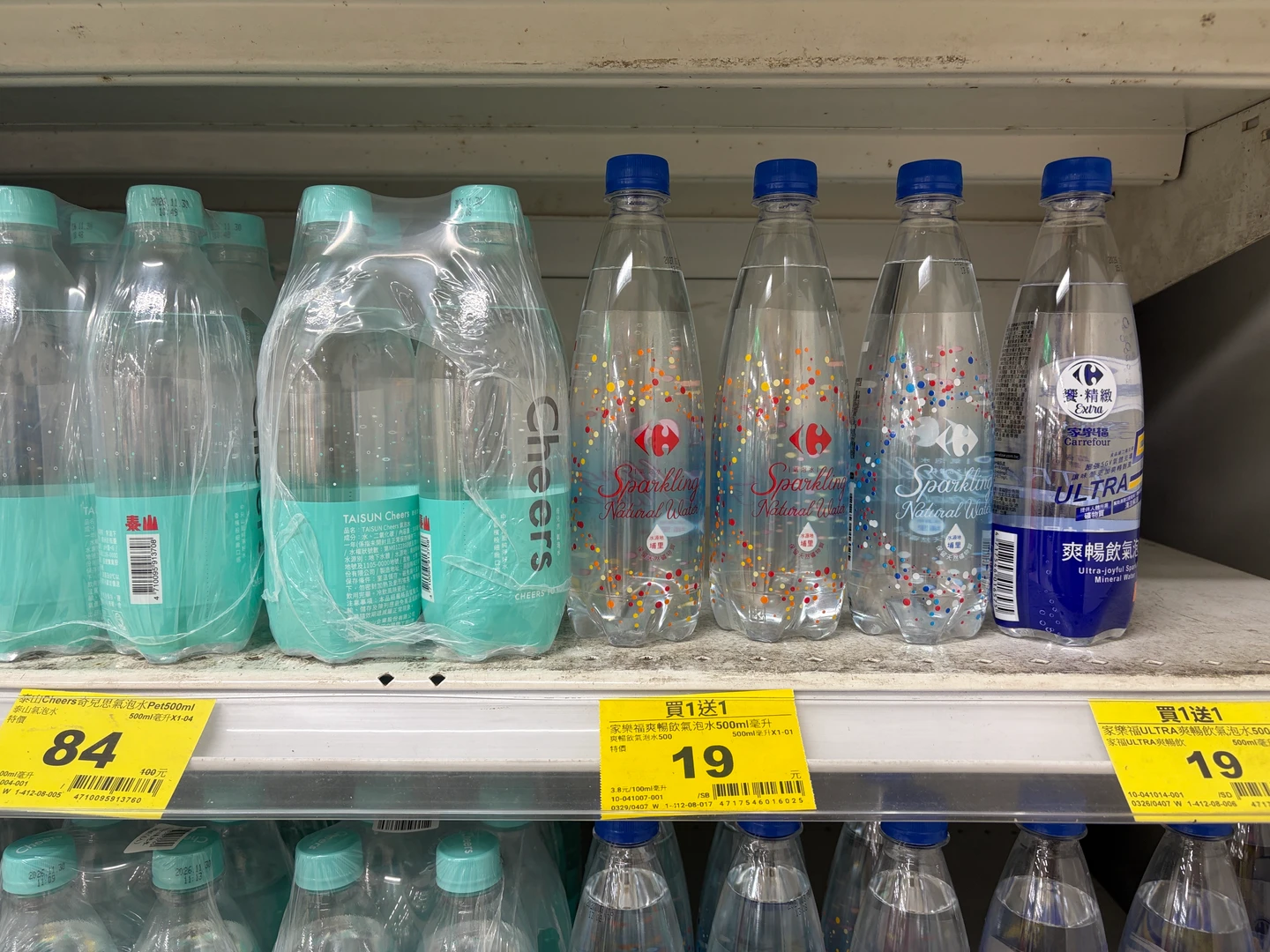 《知新聞》現場直擊,家樂福爽暢飲氣泡水500ml、家樂福ULTRA爽暢飲氣泡水皆優惠19元且享買1送1,對比一旁泰山Cheers奇兒思氣泡水500ml 4瓶特價84元,等於家樂福比泰山便宜了約54.8%;自有品牌大約是其他品牌8折價,至少都有減30元以上優惠,約打8.8折。