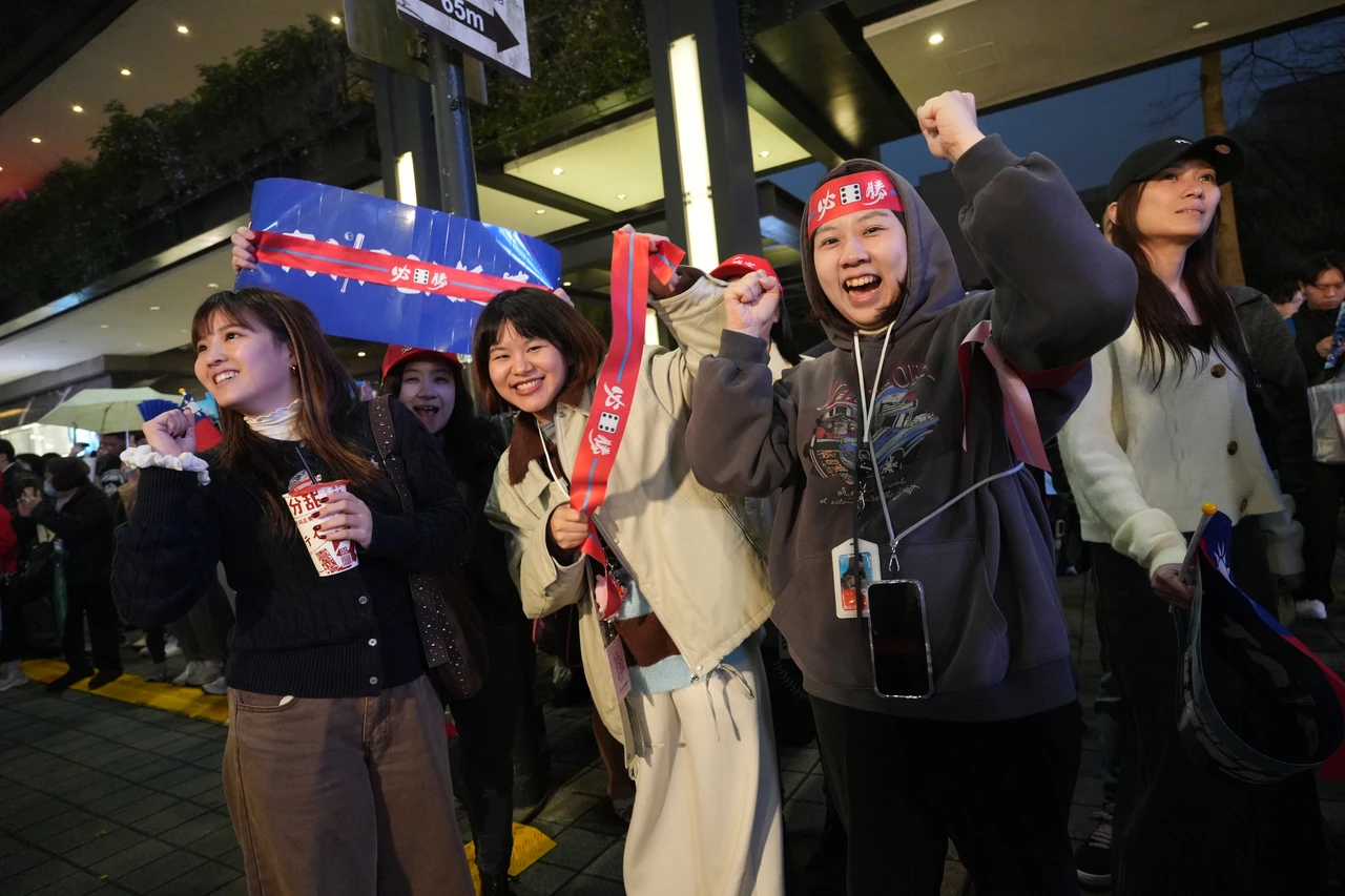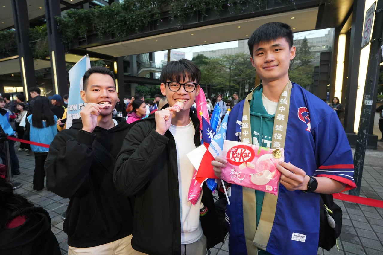 一群台大生今天傍晚一下課就前來信義區香堤大道卡位,《知新聞》記者詢問,有特別帶什麼應援小物來現場集氣,王同學表示,帶了日本人氣零食準備要來「吃爆日本」,笑稱:「吃掉它就可以贏日本。」黃同學也同樣是下課就前來現場,他表示「已準備我的喉嚨,準備好要來好好應援,喊破聲也沒關係!」