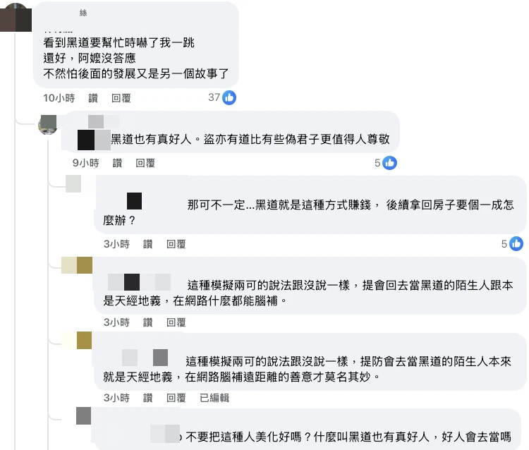 但有網友認為:「這種時候真的需要黑道出來誒」、「黑道也有真好人。盜亦有道比有些偽君子更值得人尊敬」。不過仍有人持反對意見:「不要把這種人美化好嗎?什麼叫黑道也有真好人,好人會去當嗎」、「那可不一定…黑道就是這種方式賺錢, 後續拿回房子要個一成怎麼辦?」