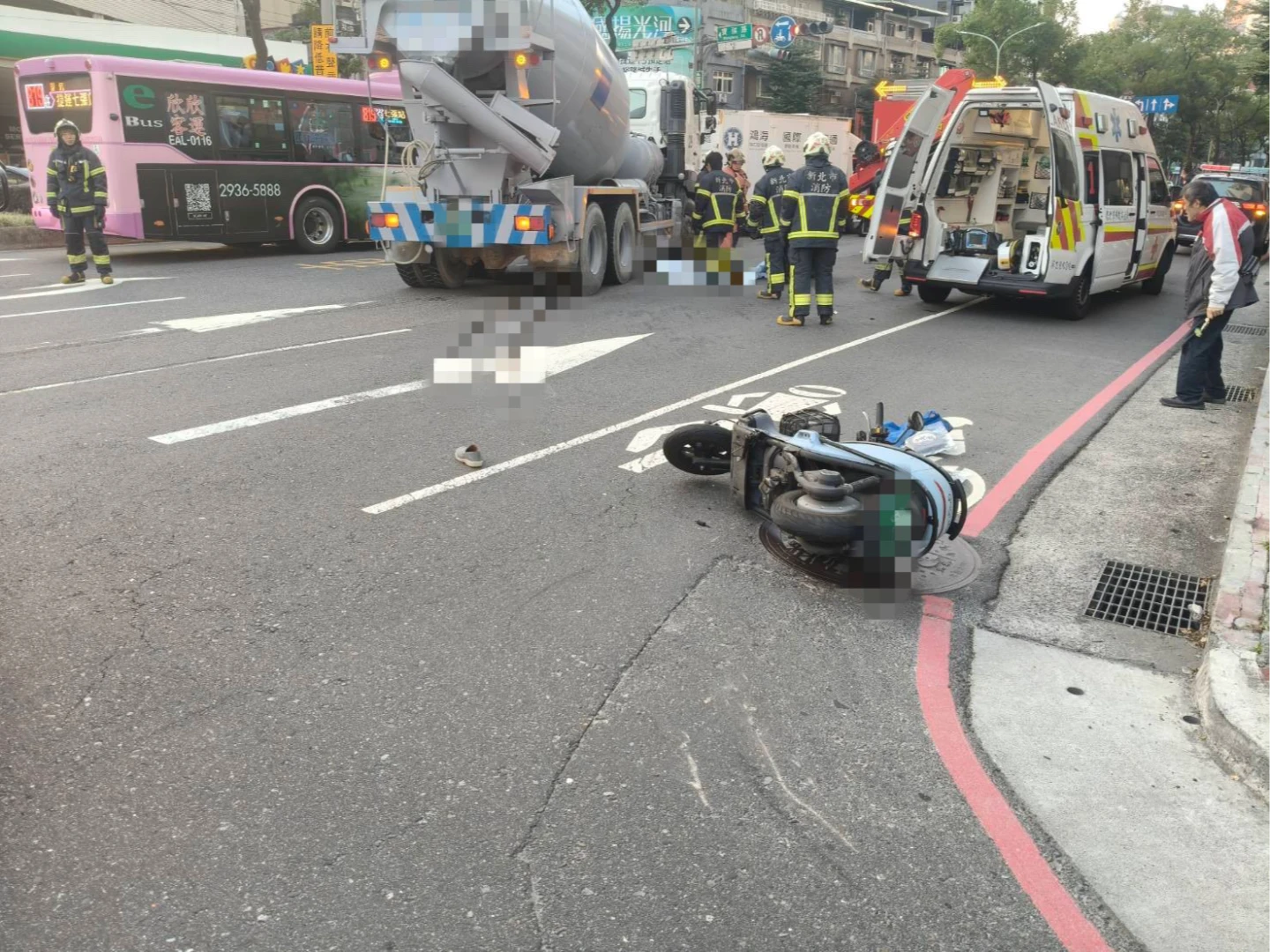 【記者曾伯愷/新北報導】新北市新店區寶中路與中興路三段路口,今天下午發生一起死亡車禍!一輛預拌混凝土車疑似右轉不慎,碰撞同向機車,導致女騎士人車滑摔捲入車底,被水泥車輾過臟器外露,當場死亡。水泥車司機沒有酒駕,肇因待查,警方也提醒,大車有視線死角,轉彎時務必遠離大型車輛「內輪差」範圍,以免因碰撞而被捲入車底。