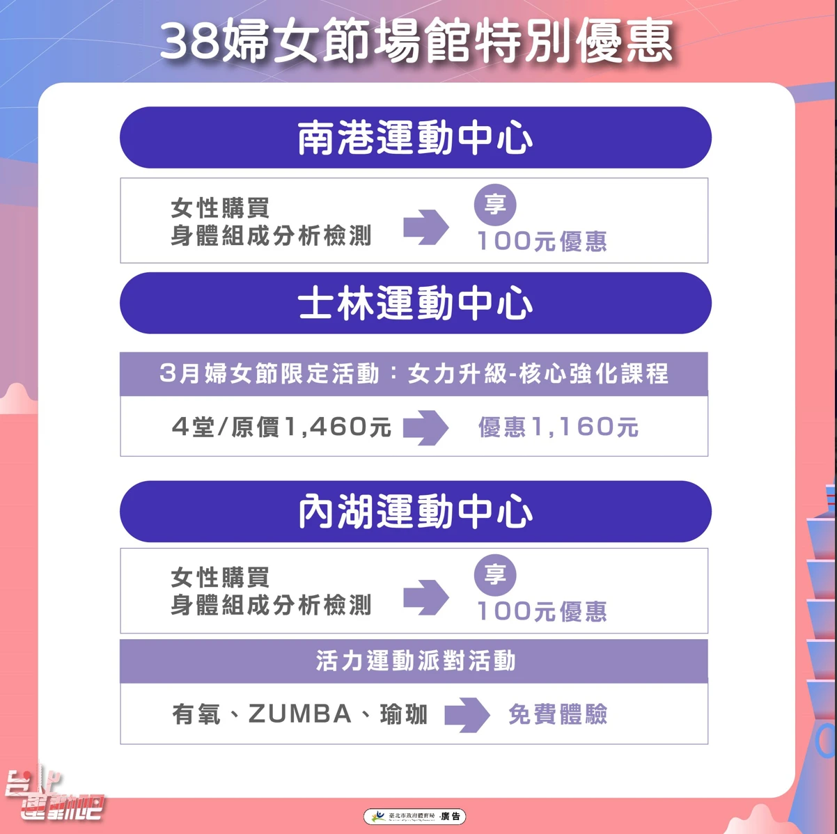 體育局除推出「U-Sport台北樂運動」,透過入場運動、戶外健走跑步即可獲得多重優惠用途的U幣,更藉由三八婦女節當天,推出女性至台北市各運動中心、公園泳池,享單次入場使用健身房或游泳池一律38元的超值銅板價。