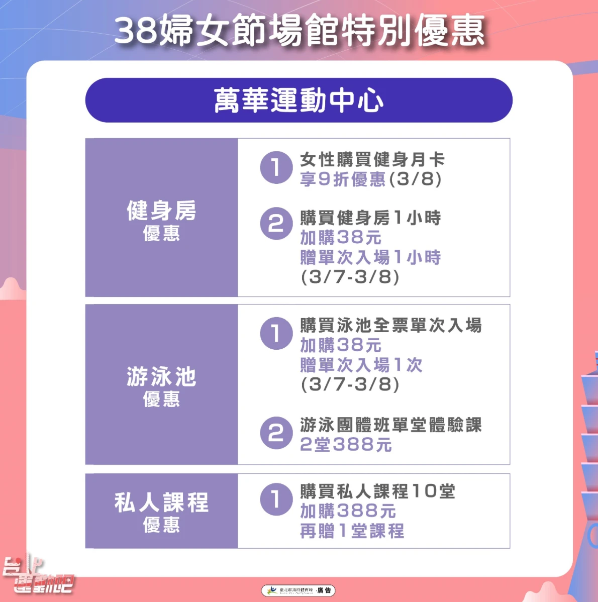歡慶38婦女節!北市推運動優惠 健身游泳只要38元銅板價