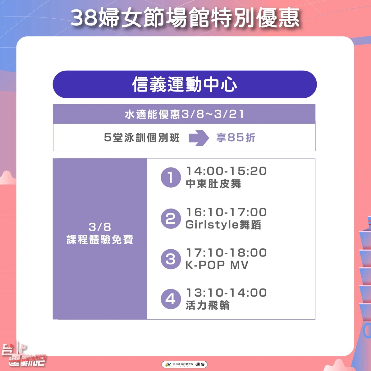 【記者許皓婷/台北報導】歡慶一年一度國際婦女節,台北市體育局宣布,3月8日推出專屬運動優惠,台北市各運動中心、永春活力館、三民公園游泳池、榮星花園游泳池及網球中心健身房,享單次使用健身房或游泳池僅38元的優惠價,各中心也分別祭出女性專屬課程優惠。