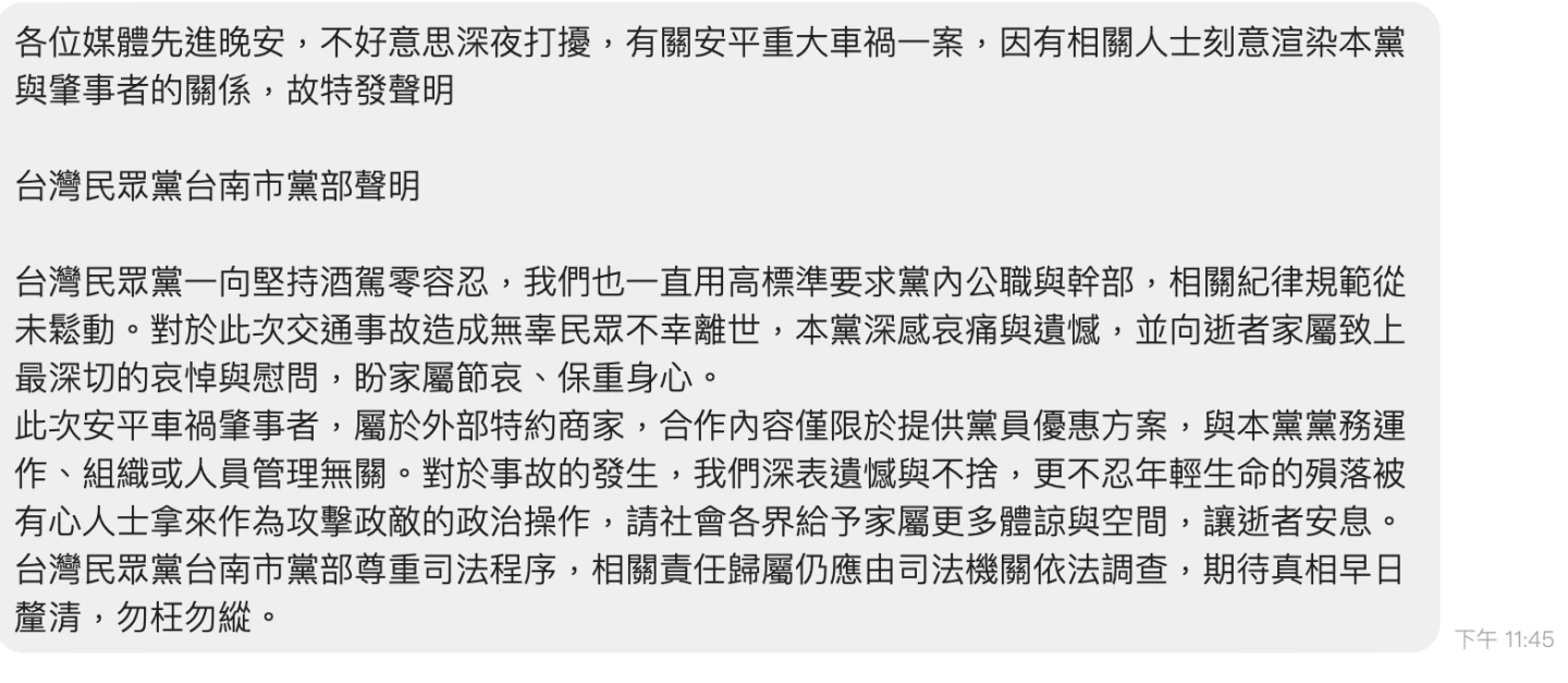 台灣民眾黨台南市黨部昨深夜發表聲明,強調黨內堅持「酒駕零容忍」,對此不幸事故深感哀痛。
