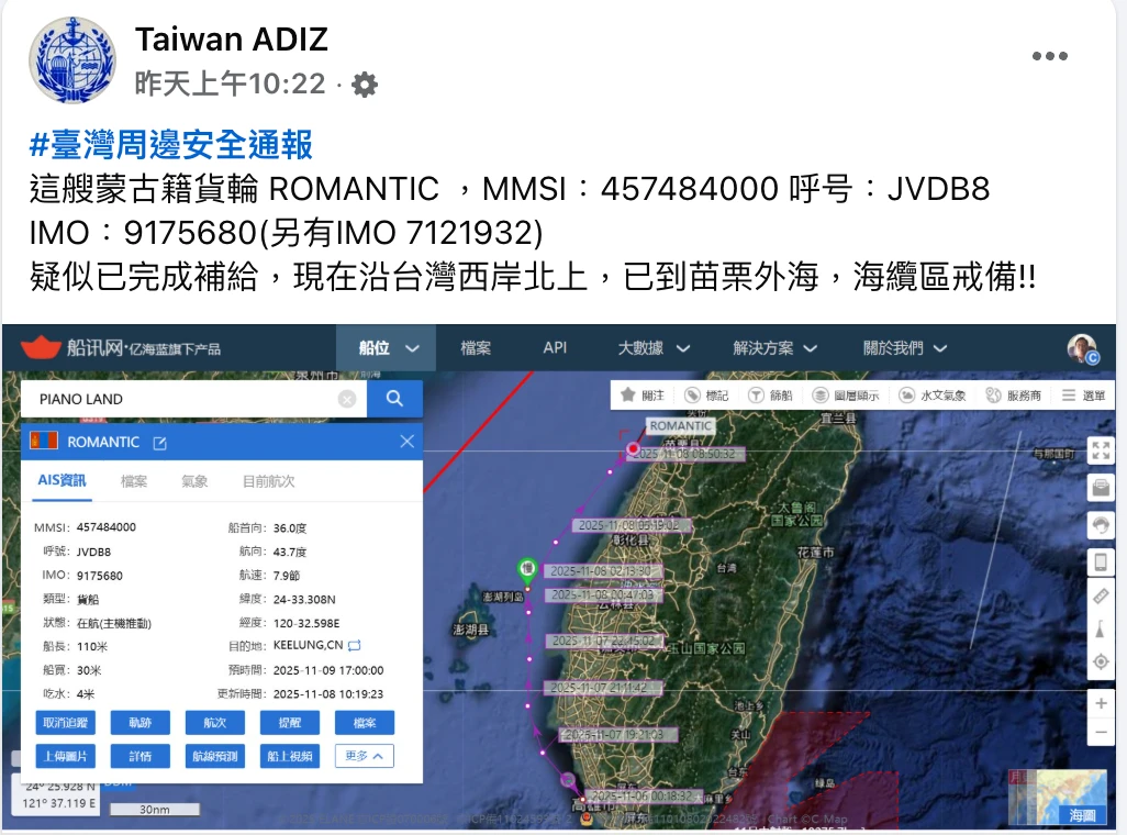 據悉,臉書軍事粉專《Taiwan ADIZ》以「#臺灣周邊安全通報」發文更新指出,這艘蒙古籍貨輪 ROMANTIC 「權宜輪」,MMSI「海事移動服務識別碼(Maritime Mobile Service Identity)」457484000 呼號「JVDB8」; IMO「國際海事組織識別碼(International Maritime Organization)」9175680(另有IMO 7121932)最少在高雄到苗栗和澎湖外海流浪一個月以上了,疑似已完成補給,現在沿台灣西岸北上,已到苗栗外海,喊出「海纜區戒備!」
