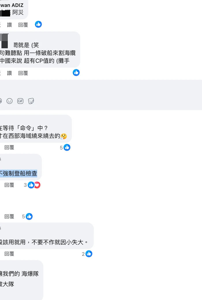 貼文一出網友底下留言怒轟「又要割電纜了嗎」有網友質疑「說句難聽點,用一條破船來割海纜,對中國來說超有CP值的」、「強制手段該用就用,不要不作就因小失大。」、「肯定是偽裝的間諜船~」、「為什麼不強制登船檢查」。