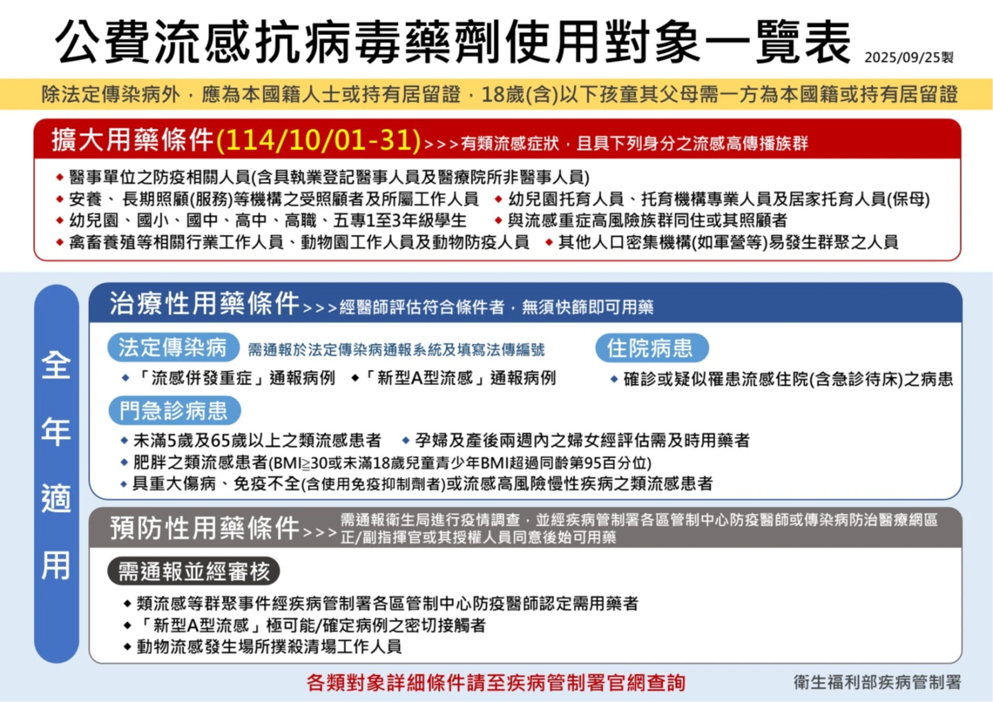 疾管署統計截至9月30日,公費流感抗病毒藥劑儲備量約294萬人份(包括原料藥156萬人份、克流感1萬盒、易剋冒130.2萬盒、瑞樂沙3.8萬盒、瑞貝塔40袋、紓伏效3萬人份),占全人口數12.6%;其中31.9萬人份配置於合約院所、衛生局所。
