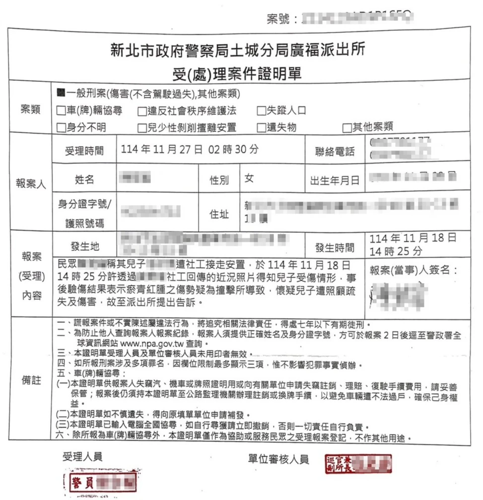 土城分局表示,11月26日下午接獲民眾報案,稱其因日前照護不當,經社工評估後認有安置必要,故進行安置,日前收到社工回報小孩近況照片時,發現有不明瘀青,便至本分局提告傷害罪及違反《兒少福利與權益保障法》,員警立即通報兒少保護並依規定受理,已通知相關人等到案說明,全案依傷害及《兒少福利與權益保障法》移請偵辦。