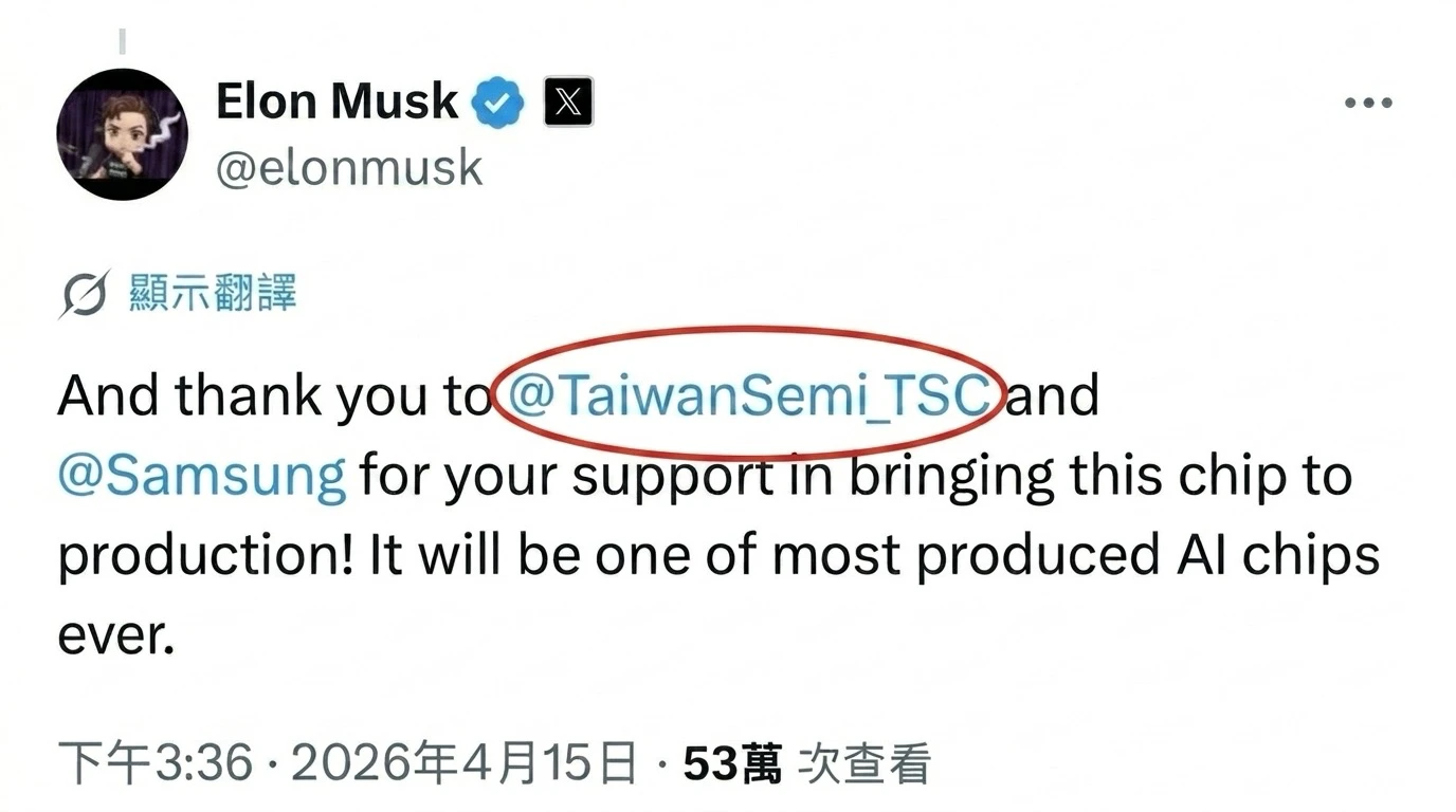【編譯于倩若/綜合外電】特斯拉(Tesla)馬斯克(Elon Musk)15日宣布其下一代AI(人工智慧)晶片「AI5」已完成設計,並親自向關鍵合作夥伴台積電與三星表達感謝,不過在提及台積電時標錯帳號,標記成另一家台灣公司「台灣半導體」(TSC,簡稱台半)而不是TSMC,鬧烏龍。