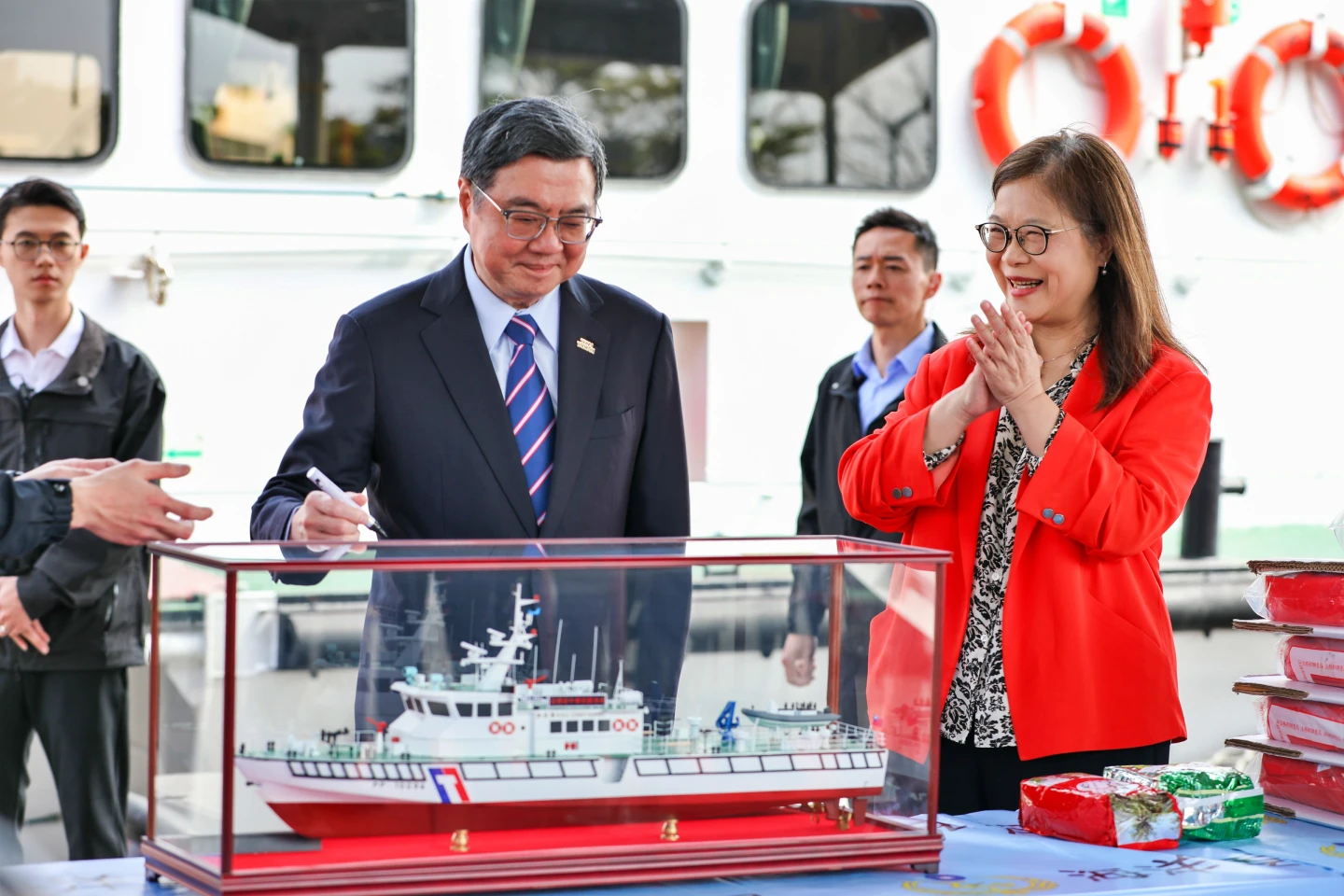 【記者王志弘/高雄報導】 台美反毒合作再下一城!海巡署、檢警調與美國緝毒局(DEA)跨國聯手,成功在東沙海域攔截坦尚尼亞籍「金昌隆號(KIM CHANG LONG)」貨輪,破獲總重近1.3公噸、市價20億元毒品。行政院長卓榮泰今天特別南下高雄表彰有功人員,更在國造海巡艇「PP-10096」模型上簽名,肯定服役不到1年即守住國境最前線。