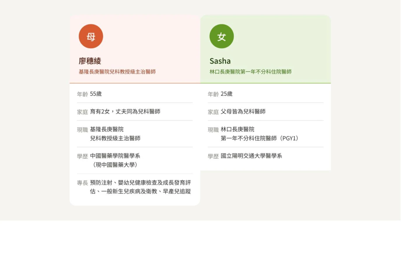 廖穗綾是基隆長庚醫院兒科教授級主治醫師,先生是同樣任職長庚系統、兒童胸腔科副教授級主治醫師賴申豪,夫妻倆育有兩名女兒,大女兒 Sasha目前是林口長庚醫院第一年不分科住院醫師(PGY1),一家出了三名醫師。母親節前夕,母女倆一起接受《知新聞》專訪,廖穗綾聊起教養孩子心法。