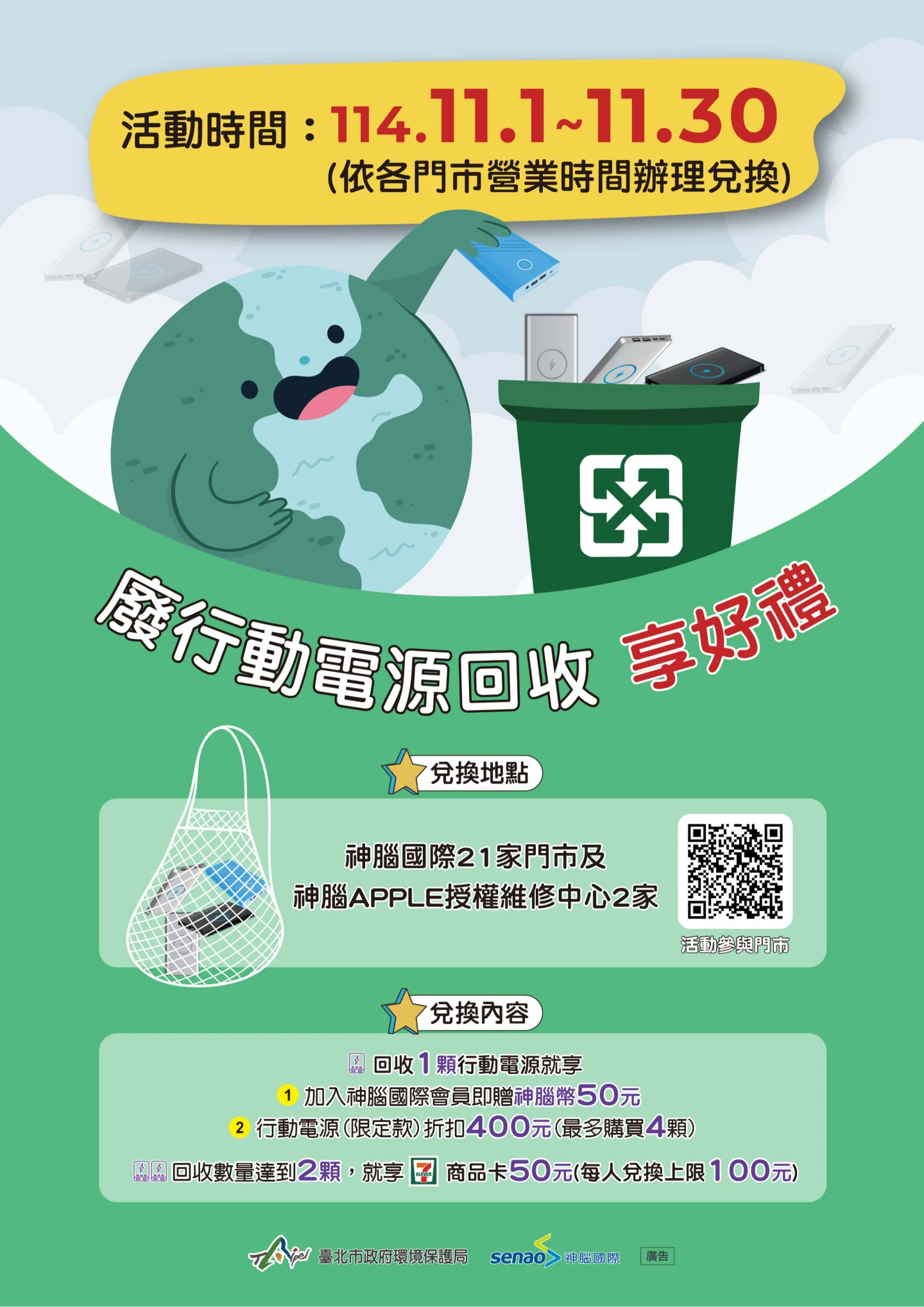 台北市環保局與神腦國際公司合作行動電源回收活動,即日起到本月30日止,只要攜帶1顆廢行動電源至北市21家神腦國際門市及2家神腦Apple授權維修中心進行回收,加入神腦國際會員即可獲得50元神腦幣,並享購買行動電源( 限定款) 每顆折扣400元優惠(最多可選購4顆)。