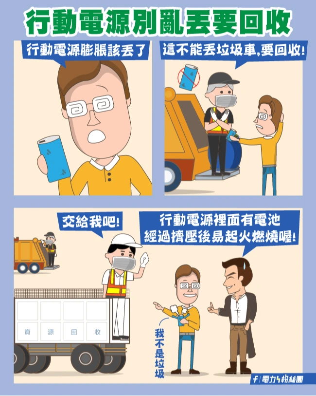行動電源若有摔過、龜裂或膨脹異常情形,建議應淘汰,別再繼續使用。不過行動電源裡面有電池芯(鋰離子或鋰聚合物電池),丟進垃圾車經擠壓會釀災,一不小心會讓清潔隊員受傷。