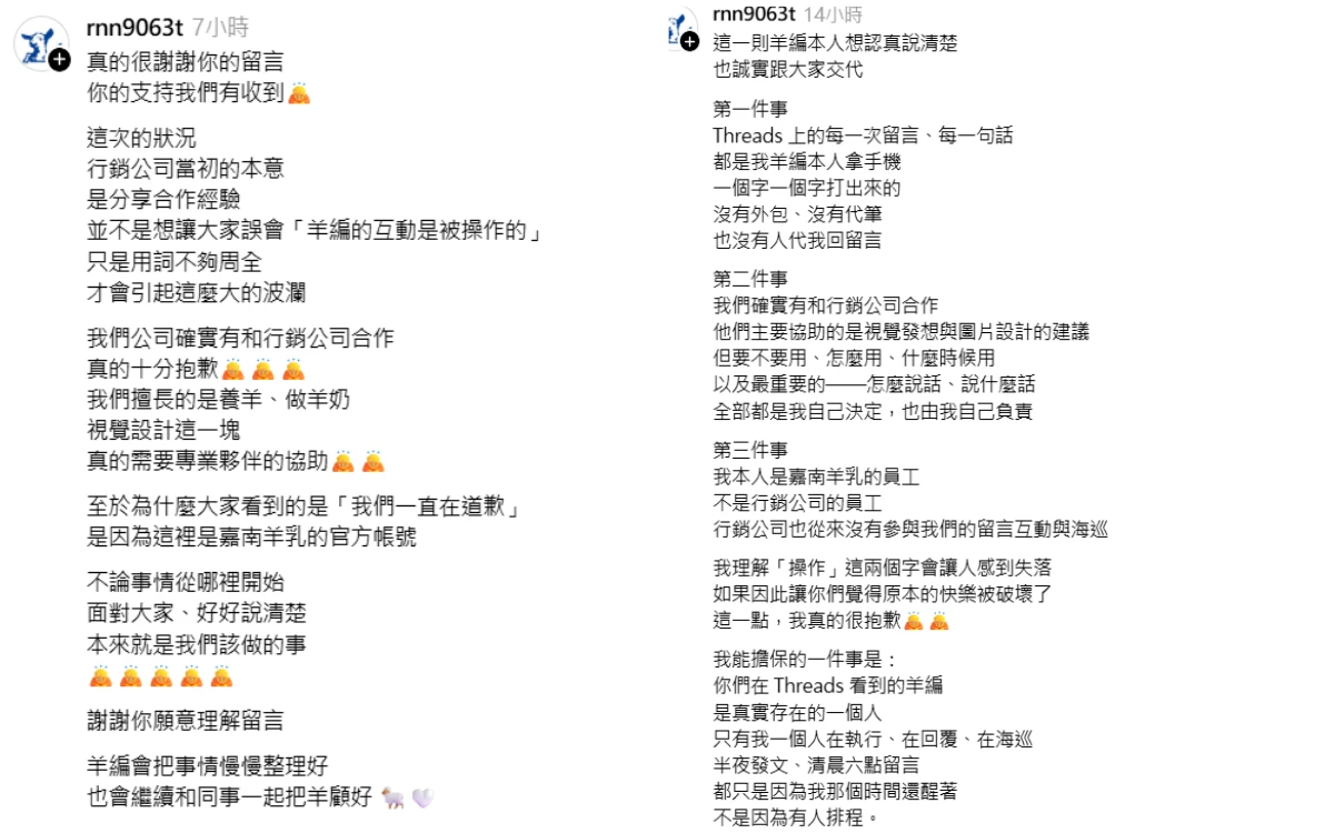 羊編強調,他是嘉南羊乳的員工,不是行銷公司的員工,「行銷公司也從來沒有參與我們的留言互動與海巡,我理解『操作』這兩個字會讓人感到失落,如果因此讓你們覺得原本的快樂被破壞了。」