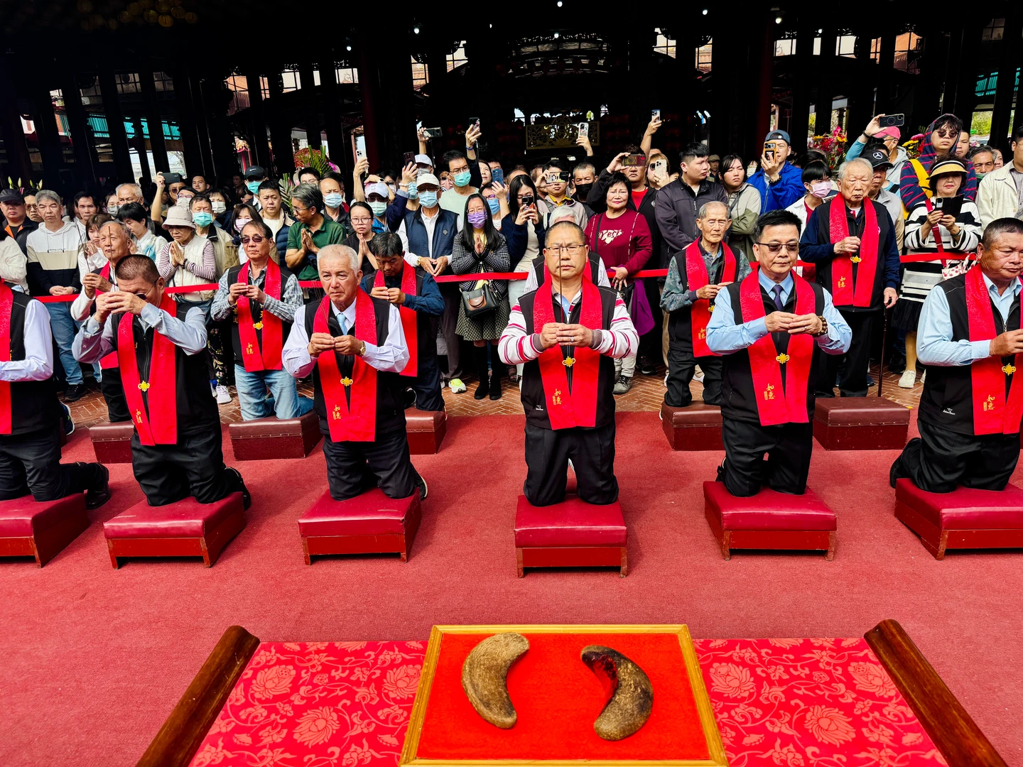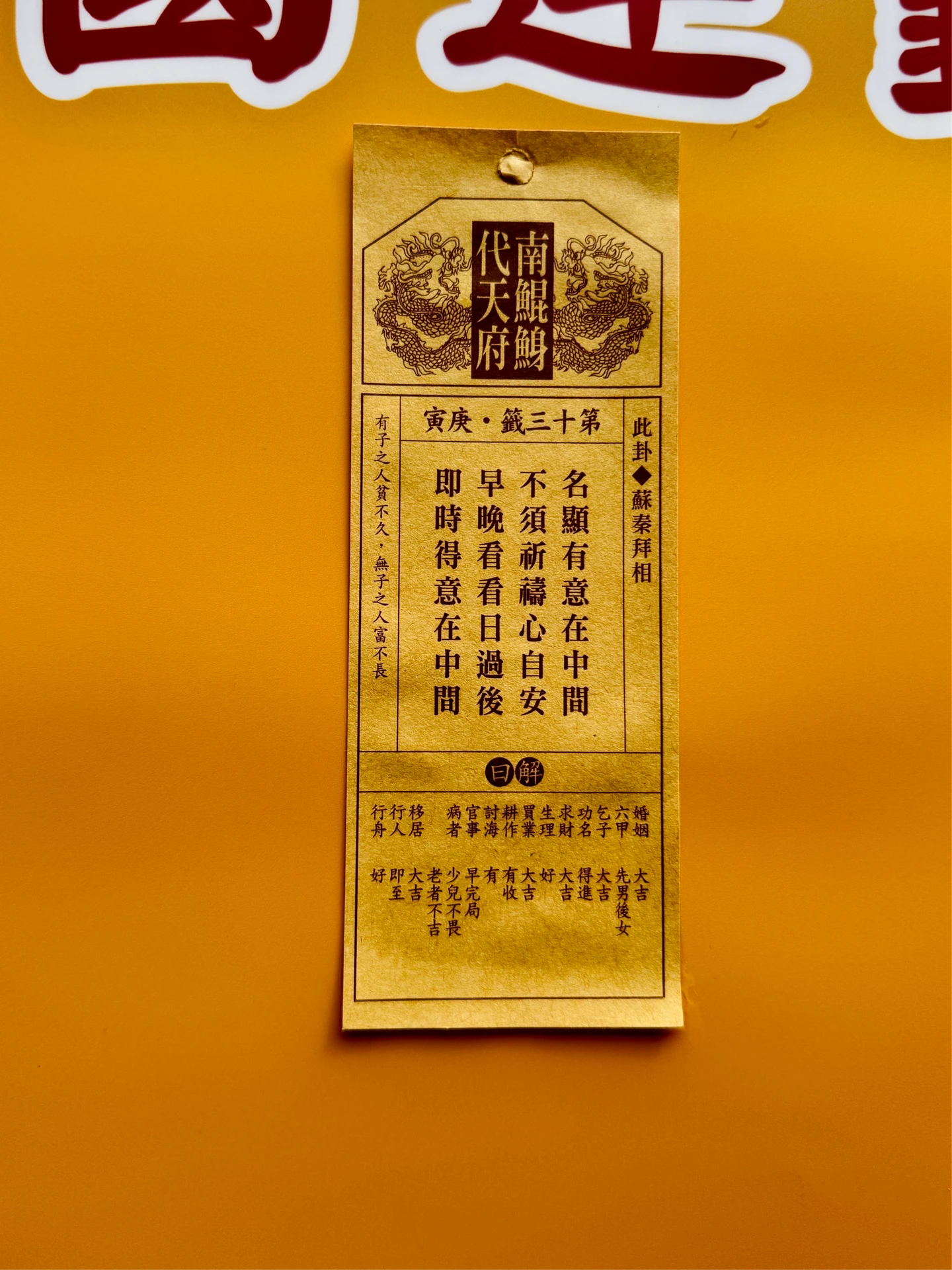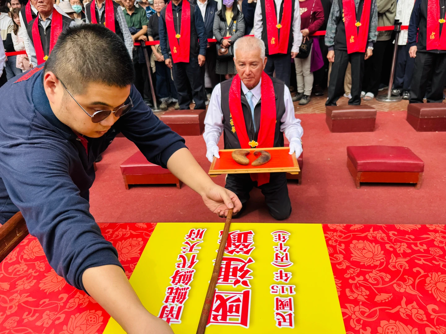 【記者王志弘/台南報導】台南南鯤鯓代天府去年(2024)國運籤抽出下籤「抽出「聞仲西征遇十絕陣後逃」。今天大年初一上午11時循古禮抽籤,在抽出第10支籤便擲出連3聖杯落定,抽出「蘇秦拜相」,廟方解籤為中上籤,跟今年元旦所抽出的吉祥字「旺」吻合,整體經濟、民生都看好。