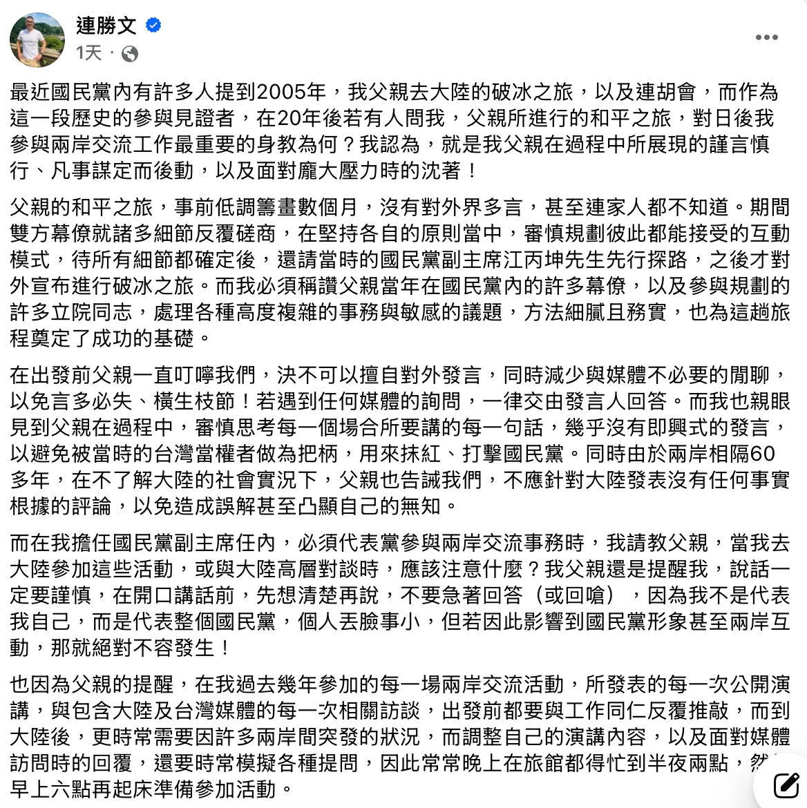 國民黨前副主席連勝文,本月4日透過臉書發文1637字回憶20年前其父連戰2005年去大陸的「破冰之旅以及連胡會和平之旅」,連勝文提到,20年後若有人問我,他認為,其父連戰此趟和平之旅,展現的謹言慎行、凡事謀定而後動,以及面對龐大壓力時的沈著,成為他日後參與兩岸交流工作,最重要的身教。