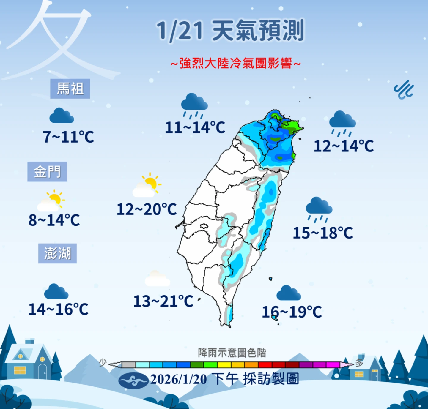 【記者陳亮諭/綜合報導】「寒情more more」中央氣象署表示,今明2天(21日、22日)是這波強烈大陸冷氣團影響最劇的時間,今晨本島平地最低溫為雲林縣古坑鄉荷苞村9.2°C,北台灣整天濕冷、北北基大雨特報,北宜及金門高溫只有13、14°C,因中層水氣增加,北台灣2000公尺以上高山有降雪機率。氣象專家林得恩說,這波冷空氣「非常接近寒流的達標臨界」,加上水氣致雪線下修,「降雨範圍較之前擴大、降雪量也較原先評估來的多」。