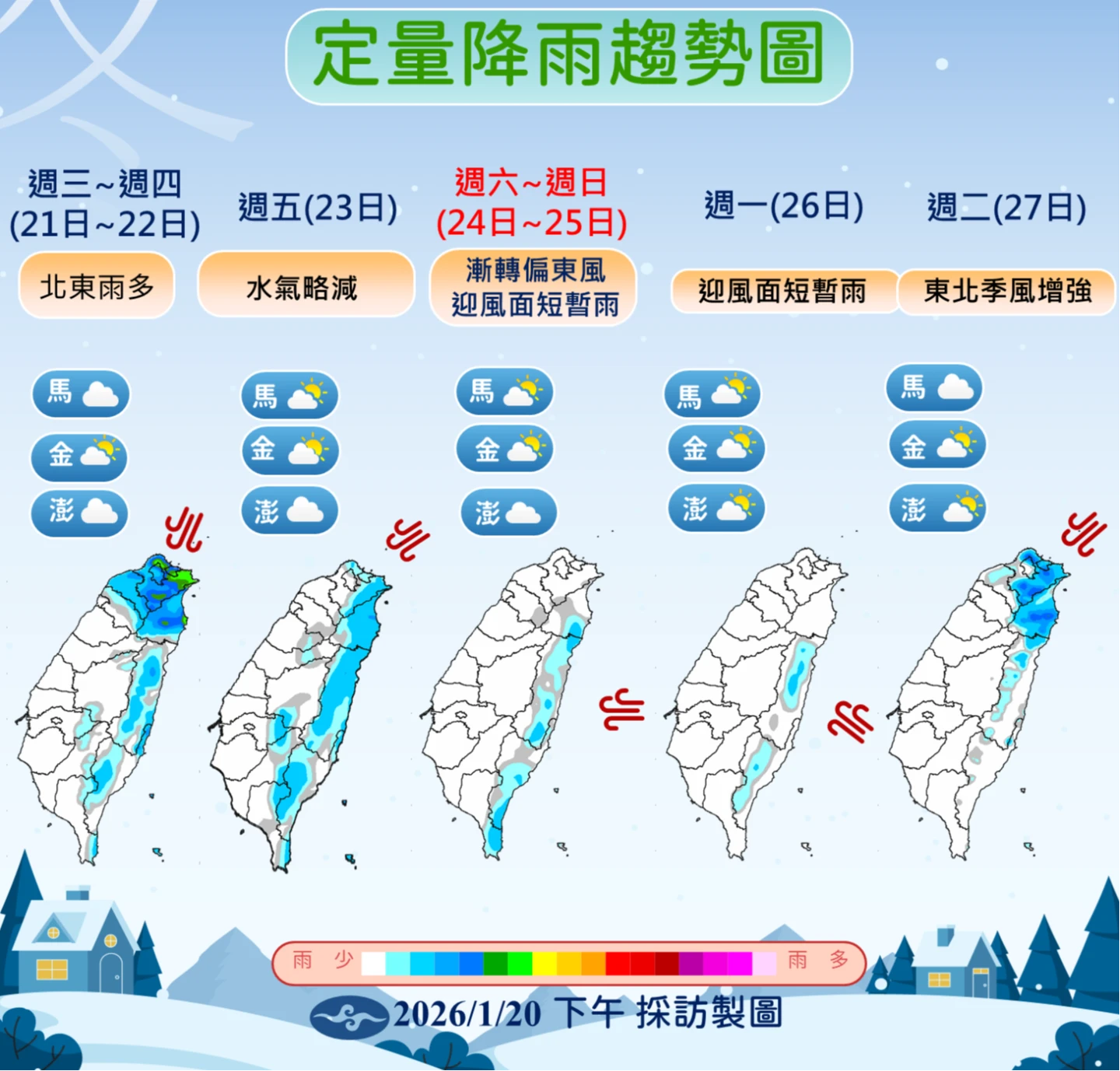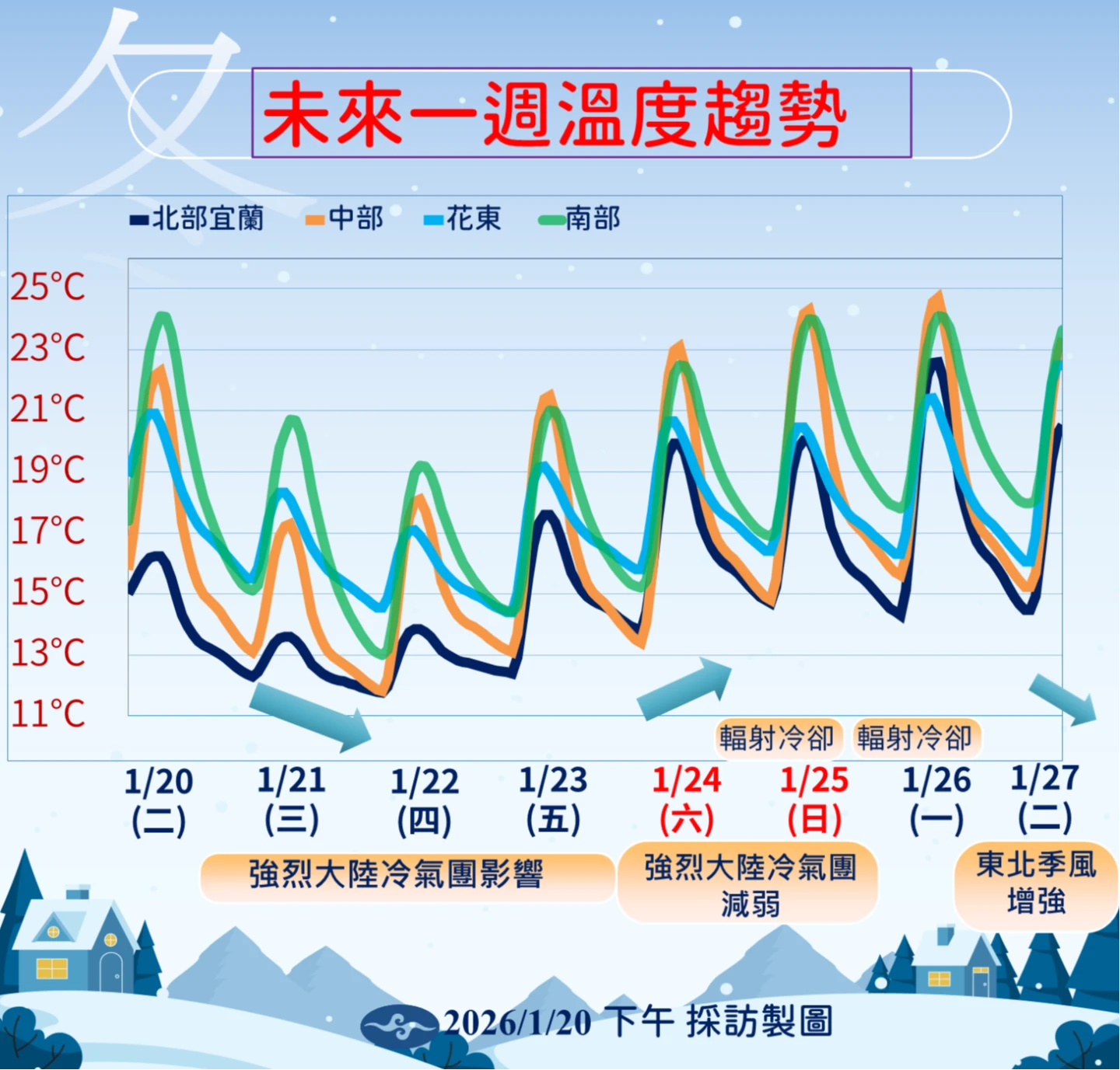 氣象署表示,冷氣團預計影響至周五(23日),周末逐漸回溫,但早晚仍偏冷。周六(24日)起強烈大陸冷氣團逐漸減弱,風向轉為偏東風,水氣大幅減少,白天氣溫雖稍有回升,但受輻射冷卻效應影響,各地早晚天氣仍偏冷,中南部日夜溫差將更為擴大。屆時降雨範圍縮減,僅剩迎風面的基隆北海岸、大台北山區及東半部有局部短暫雨,其他地區將轉為多雲到晴的穩定天氣。