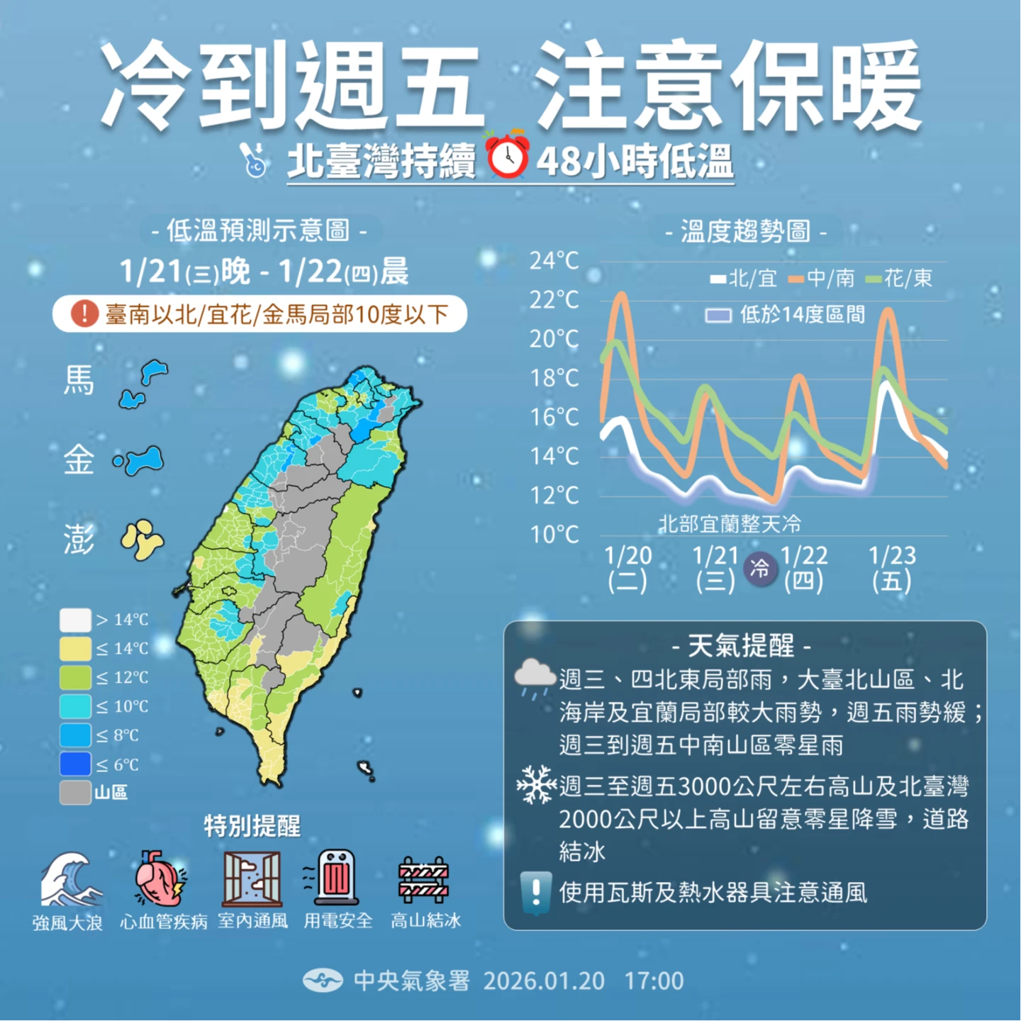 氣象署說,強烈大陸冷氣團持續影響,北台灣雨勢明顯,雙北及基隆大雨特報,寒冷感受一整天持續,中部以北及宜花長時間低溫,局部下探10°C左右,針對低溫發布燈號警示,新北、基隆、台北、桃園及新竹縣列為「橙色燈號(非常寒冷)」,有持續10°C左右或以下氣溫發生的機率;苗栗、南投、雲林、嘉義縣及金門為「黃色燈號(寒冷)」,可能出現10°C以下低溫。