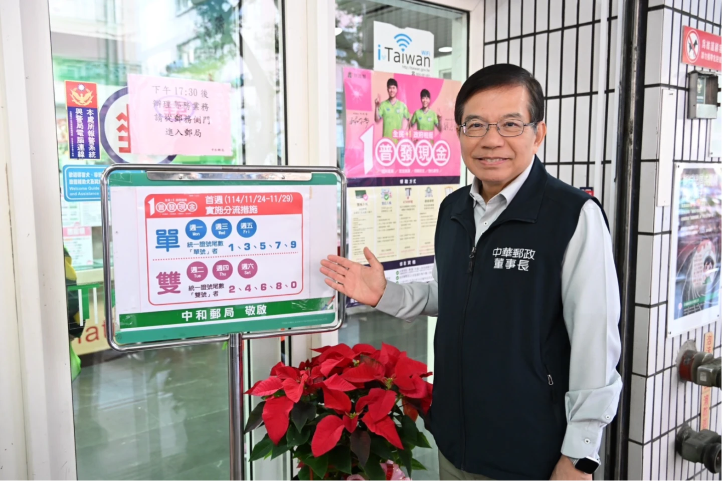 配合政府「全民+1 政府相挺」政策,中華郵政公司今(11/24)日啟動各地郵局櫃檯領現作業,全台1292間郵局均可提供服務,為力求臨櫃領現過程順暢無虞、便捷高效,首週實施證號末碼單、雙號分流措施,並規劃排隊動線與標準作業流程、加派人員引導及事前演練。