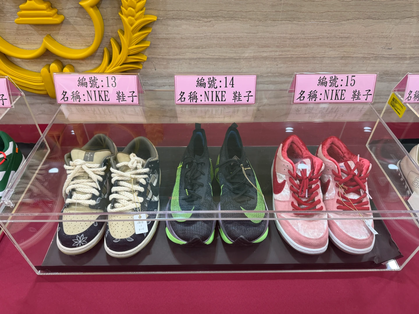33件拍賣品包括HERMES(愛馬仕)、STEFANO RICCI、CHROME HEARTS(克羅心)、GOYARD、PRADA、BALENCIAGA、DIESEL等二手名牌包,二手名牌鞋款則有香奈兒、CHRISTIAN DIOR、BALENCIAGA、JORDAN、NIKE限量款球鞋,還有茶壺、茶杯等茶具。