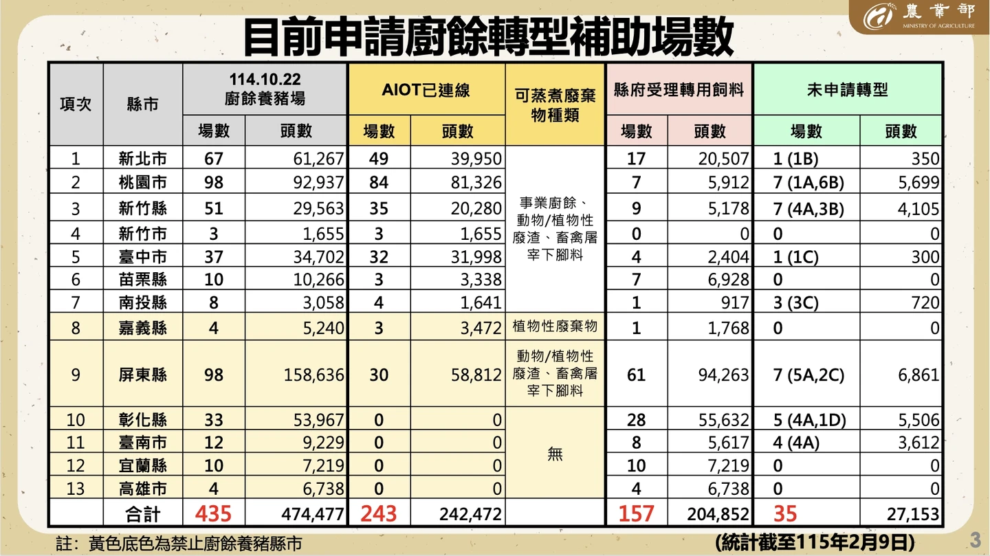 行政院今召開院會後記者會,農業部畜牧司長李宜謙盤點,去年10月22日全國435場廚餘養豬場,其中243場有申請AIOT(溫度監控設備)、有條件繼續使用廚餘養豬,另192場不再使用廚餘;包括已申請轉型飼料補助的157場,及35場未申請轉型飼料補助。