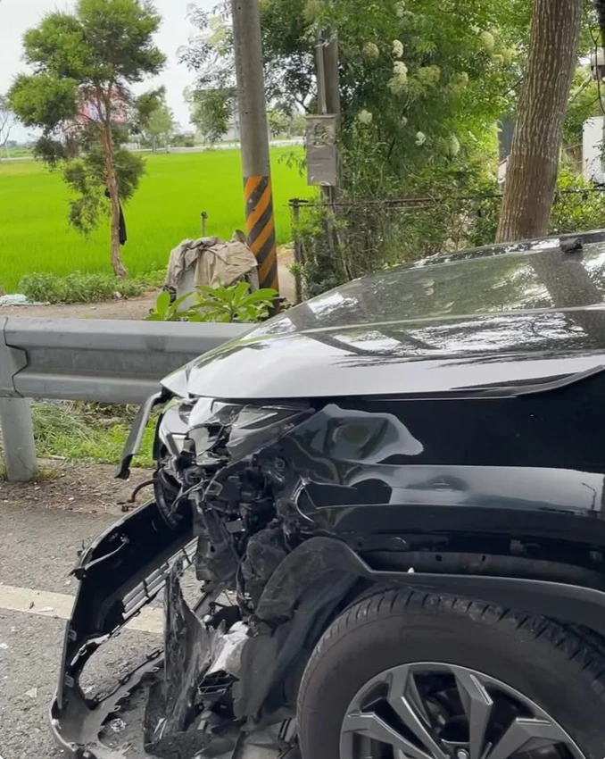 林沄蓁在Thread貼出自家車子左車頭嚴重毀損照片,指稱簡男在警察抵達前求情說:「姐啊,我酒駕無照,妳車損看多少我現金全賠給妳,妳不要報警好嗎?」