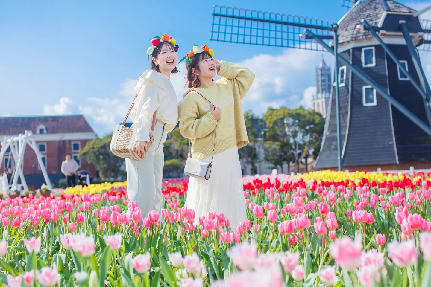 另外,豪斯登堡每年春天登場的「花之慶典」為園區最具代表性的季節活動之一,從春季盛開的繽紛鬱金香到5月中旬初夏綻放的玫瑰,遊客可漫步於「花卉道路」,欣賞日夜變化的花之絕景,搭配歐式街景與運河風光,宛如置身歐洲花園般的浪漫。清明連假期間,豪斯登堡宮殿前還有盛開的原創品種鬱金香「豪斯登堡」夢幻花海。
