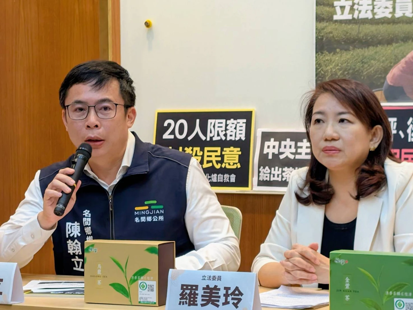 羅美玲今邀集陳翰立、沈夙崢、名間鄉反焚化爐自救會代表陳秋娟、看守台灣協會秘書長謝和霖,及農業部、環境部官員共同召開記者會,訴求「守護台灣茶,名間焚化爐暫緩環評」。