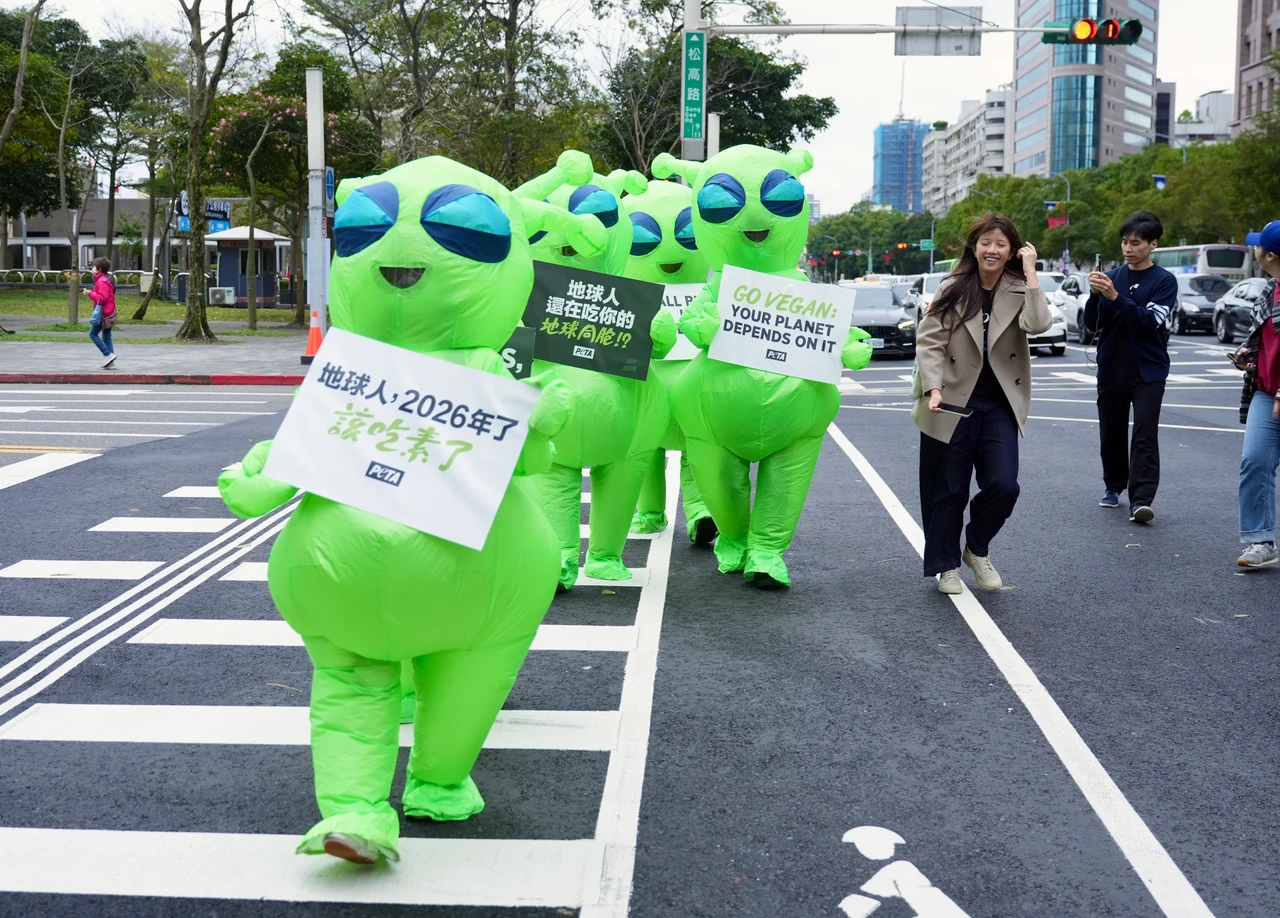 五位全身亮綠、造型前衛的「外星人」沿街遊行,吸引不少小朋友的目光,引來家長幫忙拍照合影留念,PETA亞洲善待動物組織總裁Jason Baker表示,「全球每年有數百億隻動物因肉品、蛋品與乳品產業而遭殘酷屠宰,同時畜牧業也是氣候變遷與生態浩劫的關鍵推手。選擇善待生命而非殘酷對待,不應如『外星語』般難以理解。2026年,讓我們一起拒絕暴力,擁抱慈悲—因為每個動物,都和你我一樣渴望活著。」