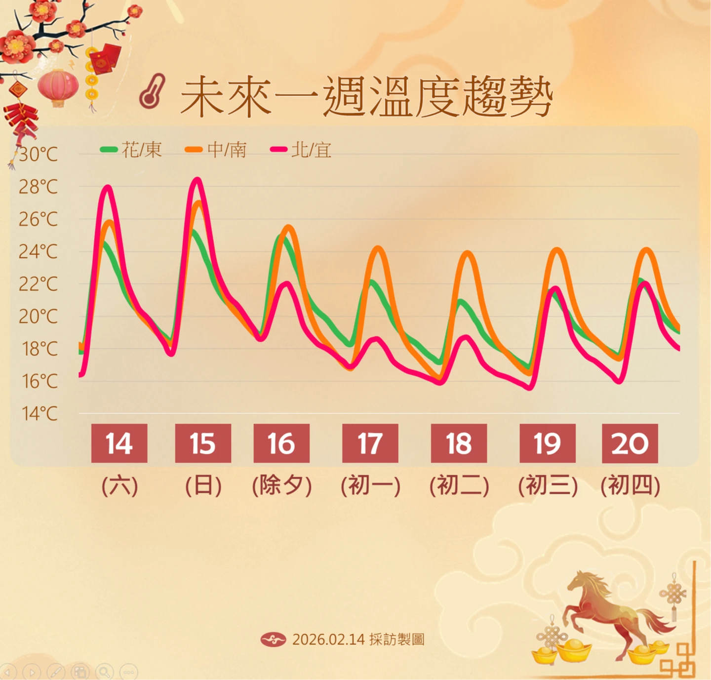 農曆春節的天氣「前暖後涼」。明天除夕起,隨著鋒面通過與東北季風增強,北部及宜蘭氣溫將明顯下降。初一(17日)至初二(18日)受東北季風影響,北部及宜蘭天氣偏涼,低溫約14至17°C,高溫僅18至22°C;中南部影響較小,白天仍有23至29°C,但早晚依舊寒涼。