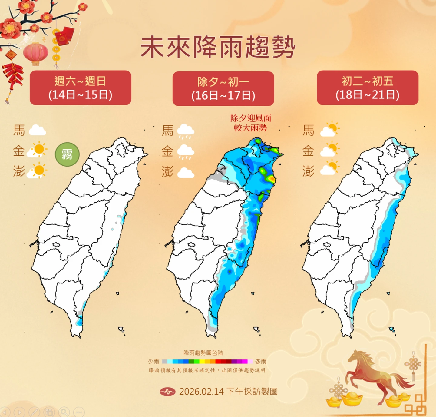 除夕當天基隆北海岸有局部較大雨勢。初一至初二,桃園以北、宜蘭、花蓮有局部短暫雨,新竹、苗栗、台東及恆春半島也有零星雨訊,中南部則維持多雲到晴的穩定天氣,適合走春行程。