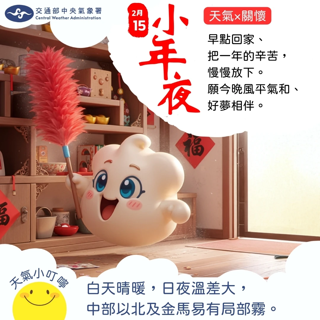 【記者陳亮諭/綜合報導】今天(15日)是小年夜,中央氣象署指出,全台陽光露臉,各地大多為晴到多雲,天氣穩定且白天溫暖偏熱,中南部高溫甚至可達30°C。明天(16日)除夕受鋒面通過及東北季風增強影響,北台灣與宜蘭將轉為濕涼,初一至初二北部低溫下探14°C;中南部仍維持多雲到晴的穩定天氣。