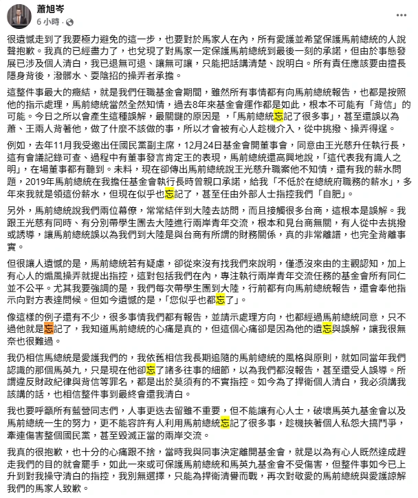 蕭旭岑深夜寫下千字長文,文中提及馬英九「忘記」、「忘了」、「遺忘」等忘詞達7次,並向馬家人致歉,因為涉及清譽,別無選擇,只能把話講清楚、說明白。