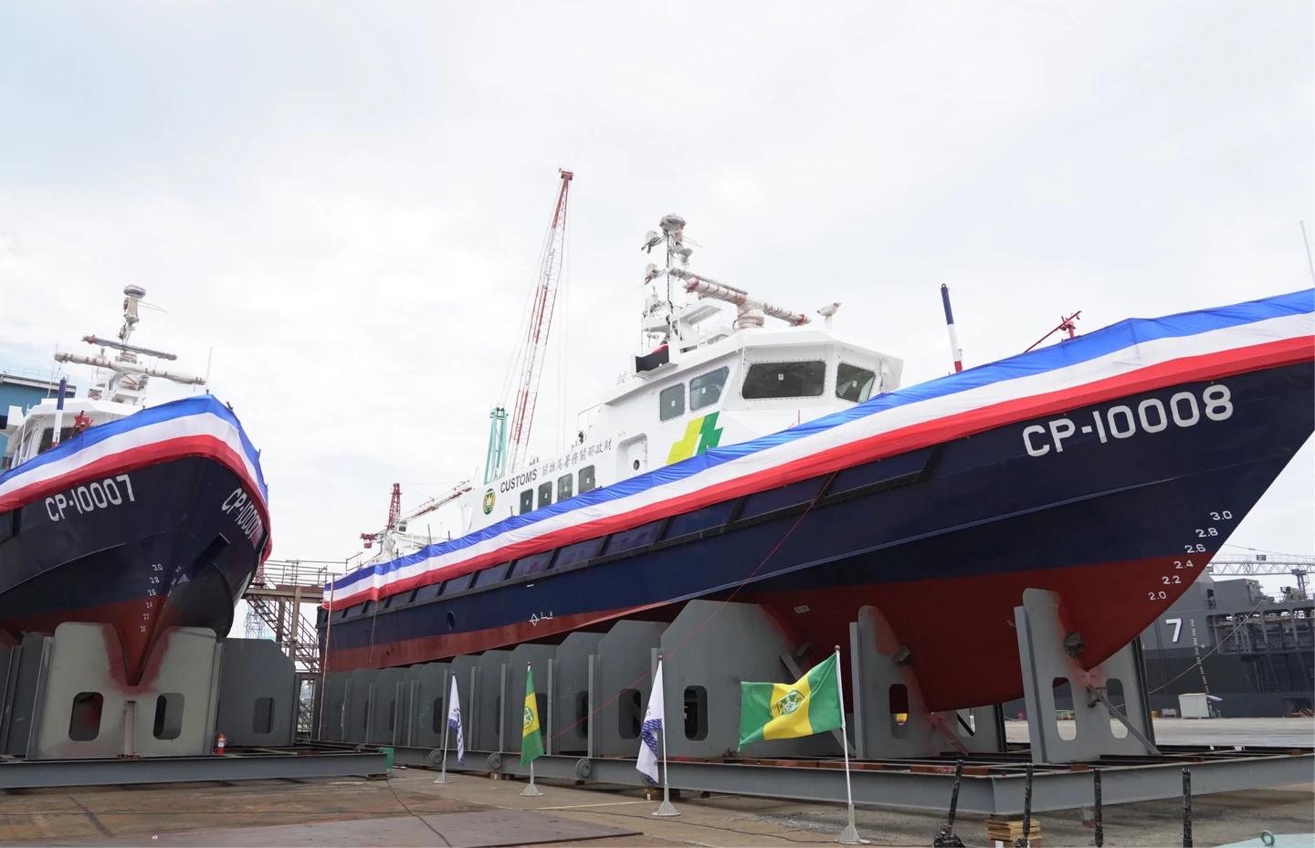 台船指出,兩艇均為32公尺級巡緝艇,採下鋼上鋁輕量化設計,兼具結構強度與高速性能,搭載2部2580KW柴油主機,在蒲氏風力3級以下最高航速可達30節(約時速55公里),有助提升海關海上執法機動性及外海監控能力,對查緝走私與不法活動更具助益。