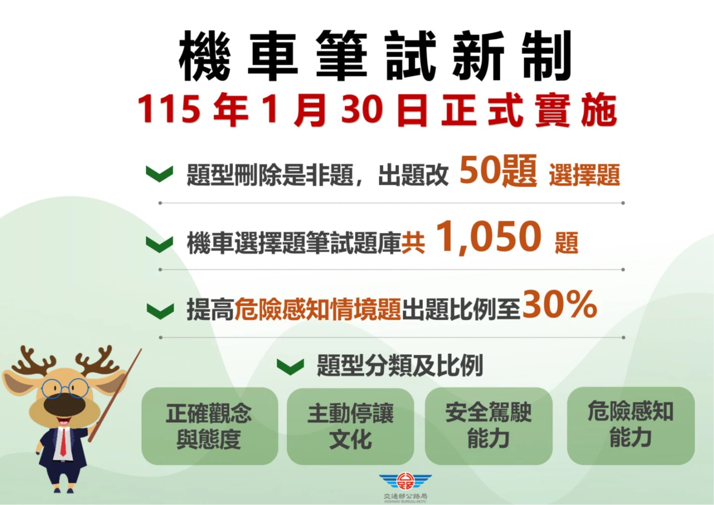 其中,115年1月30日起實施機車駕照筆試題庫新制,「全面取消是非題,統一改採50題選擇題形式測驗」。新制題庫共計1,050題選擇題,並導入「以人為本」之核心理念,題型架構分為「正確觀念與態度」、「主動停讓文化」、「安全駕駛能力」及「危險感知能力」等四大類。而「危險感知能力」相關之情境題與影片題,將由現行10題調整增加至15題,占整體考題比率由20%提高至30%,以強化考生對道路風險之辨識與因應能力。