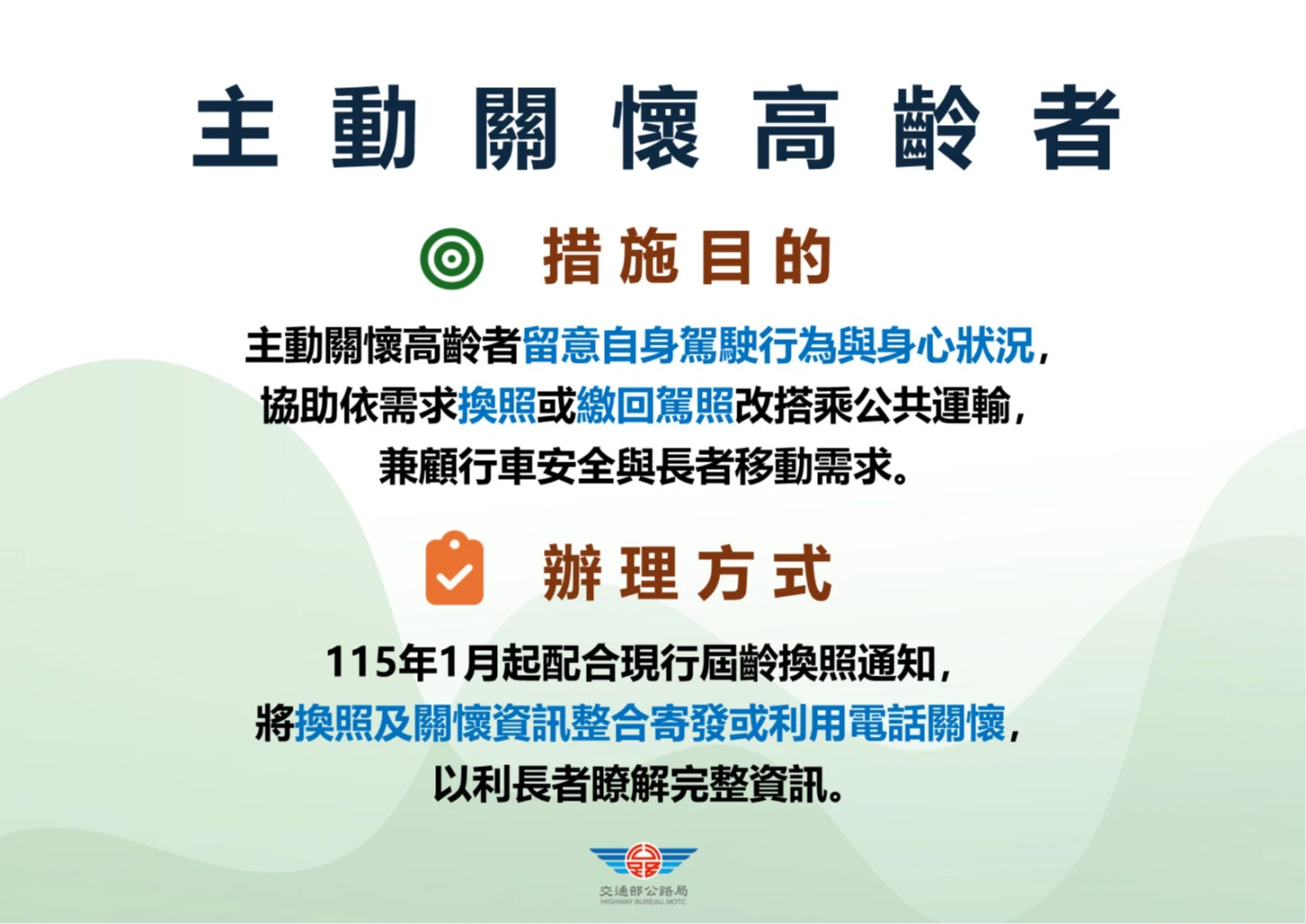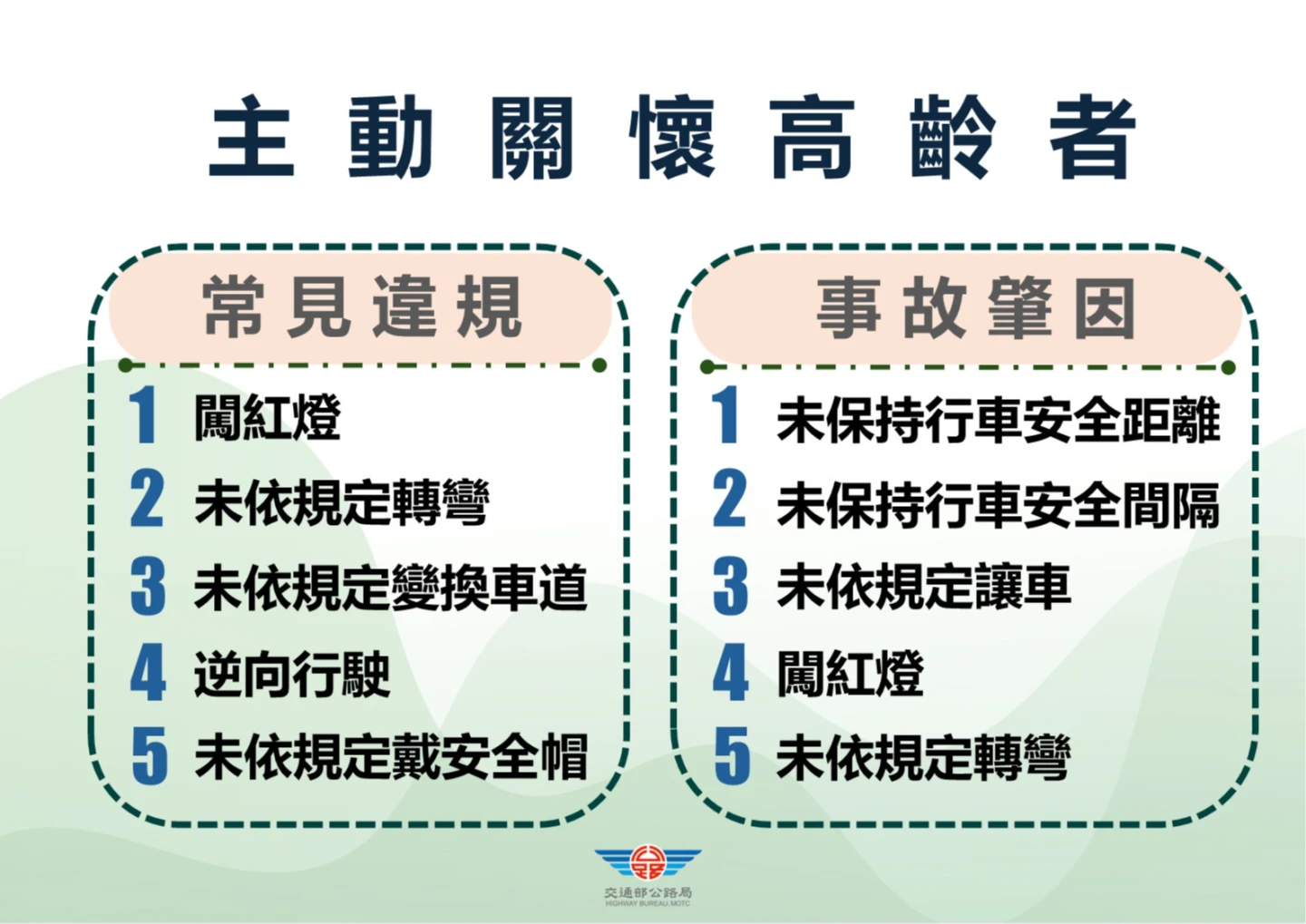 對於「主動關懷高齡者」部分,提醒高齡長輩應避免之違規情境,依事故及違規統計資料分析關懷高齡長輩常見違規及事故肇因第一當事人,結合既有屆齡換照通知作業寄發提醒通知單,及利用電話關懷高齡者留意自身駕駛行為與身心狀況,兼顧高齡者行車安全與移動需求。