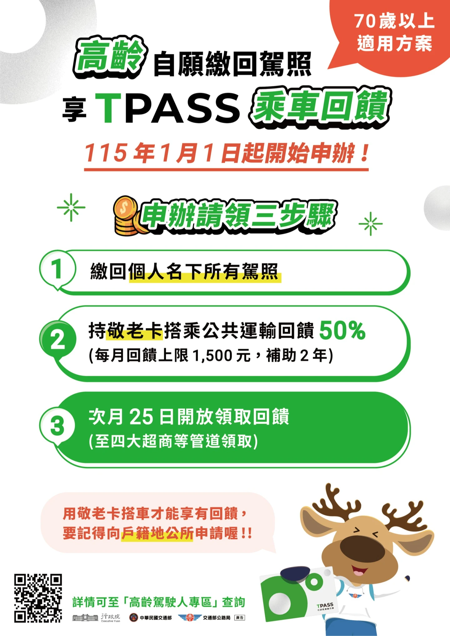 自今年1月1日起也針對「70歲以上繳回駕照者補助TPASS乘車優惠回饋」,名下駕照皆自願繳回的長者,持敬老卡搭乘公共運輸回饋50%,補助2年期間,每月回饋上限1,500元。