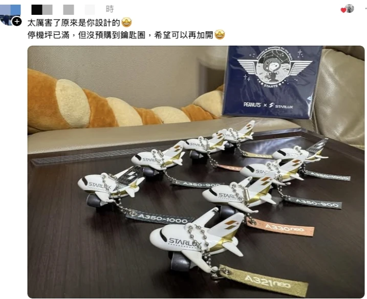 網友湧入Sherry發文熱議留言:「什麼!你就是這場全台打搶貨的幕後設計者,那…以後可以許願更多不一樣的周邊嗎~」、「可是,為什麼鋪貨那麼少?買不到啊……🥲」、「希望能多一點,已經有人在炒價了」、「換到兩個A321neo,然後晚上跟脆友交換換到我想要的A350-1000,可惜飄帶太搶手,根本換不到🤷♂️」、「今天搶到五個,跑了好多門市,很喜歡 超讚👍🏻」、「太厲害了原來是你設計的🤩,停機坪已滿,但沒預購到鑰匙圈,希望可以再加開🤩」。