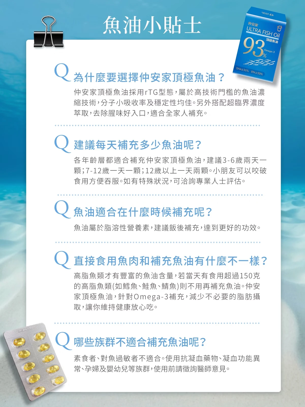 仲安家頂極魚油直擊痛點,主打「業界最高純度」,其Omega-3含量高達93%,其中EPA≧50%能促進新陳代謝,DHA≧36%有助於靈敏思緒,如此比例,讓消費者每一口吃下的都是純粹精華,而非無用的油脂。