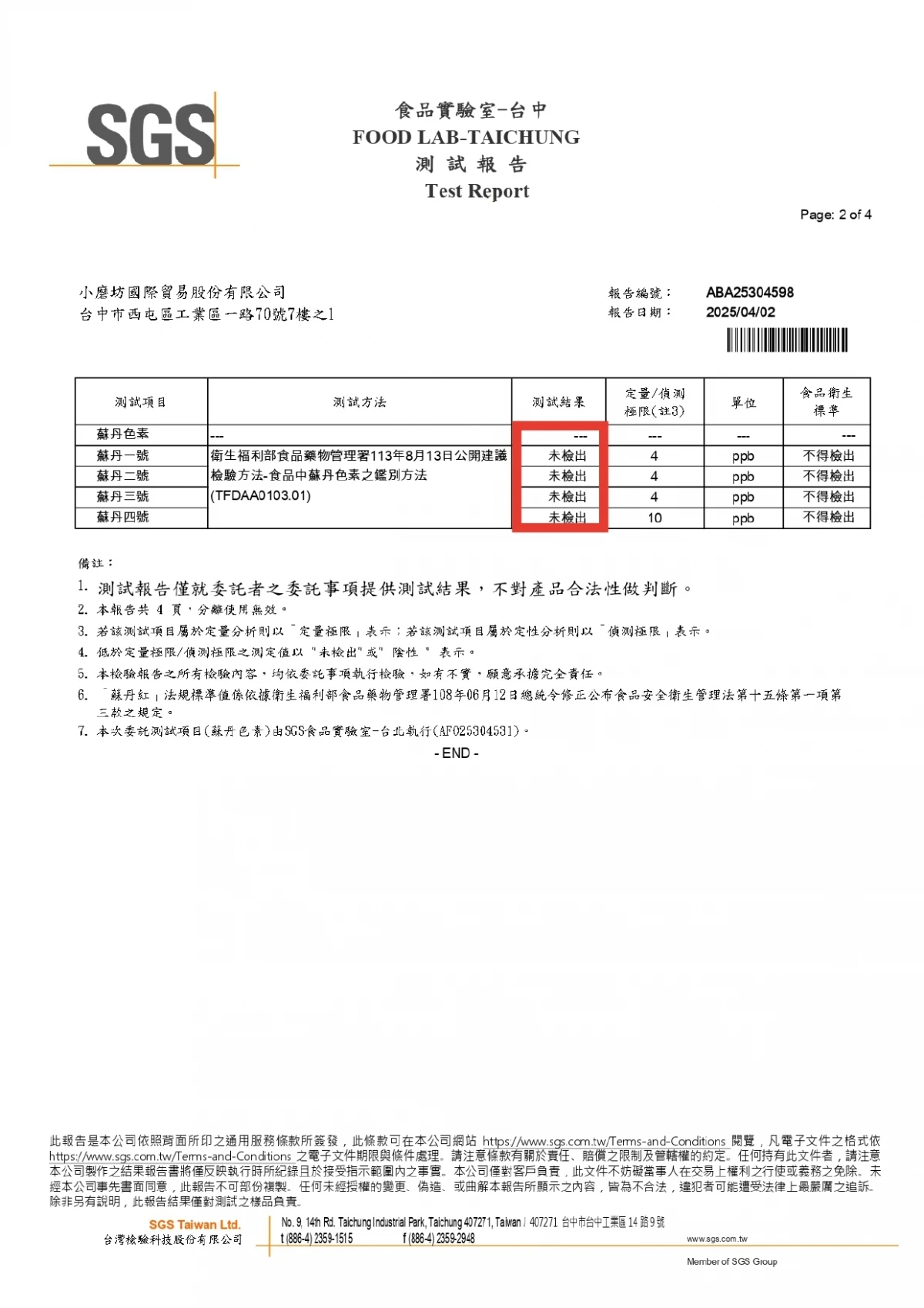 小磨坊表示,一直以來依《食安法》嚴格落實自我監管,該批原料於進口前,已依國際抽樣原則取得具代表性的樣本,並於2025年3月24日送交SGS檢驗,結果為合格。檢驗項目包含蘇丹色素、農藥殘留、重金屬等十項食安指標,其中蘇丹色素結果為合格,確認所有檢驗皆符合台灣食品安全相關規範,才啟動後續採購進口作業。