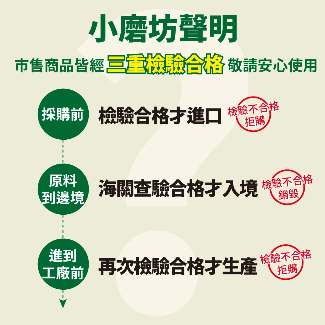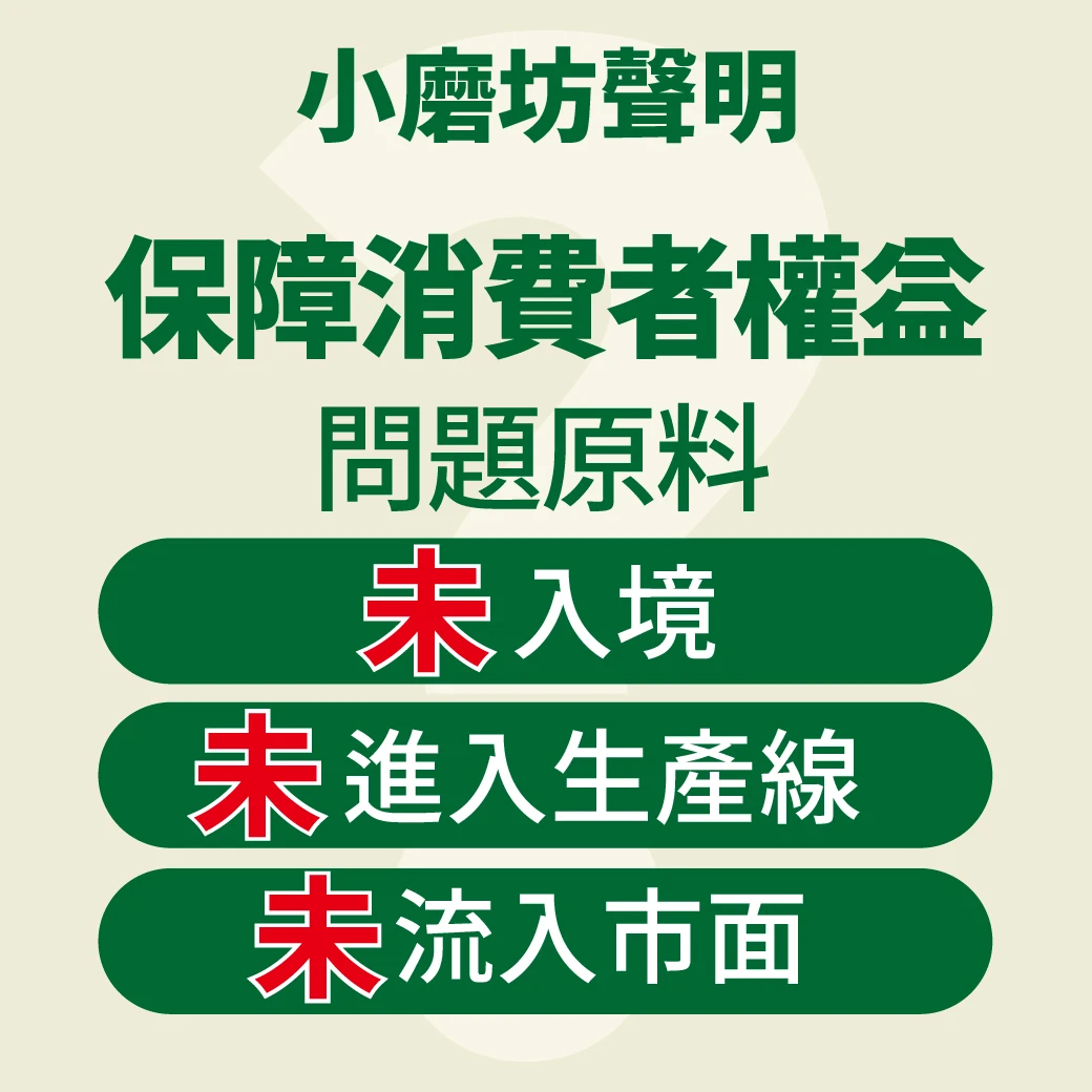 為保障消費者權益,小磨坊尊重邊境查驗結果,並以食品安全為最高原則。即使自主檢驗為合格,本公司於接獲通知後,仍立即通知供應商拒絕驗收,並依政府規定啟動銷毀程序。該批原料完全未進入生產線,亦未流入市面。