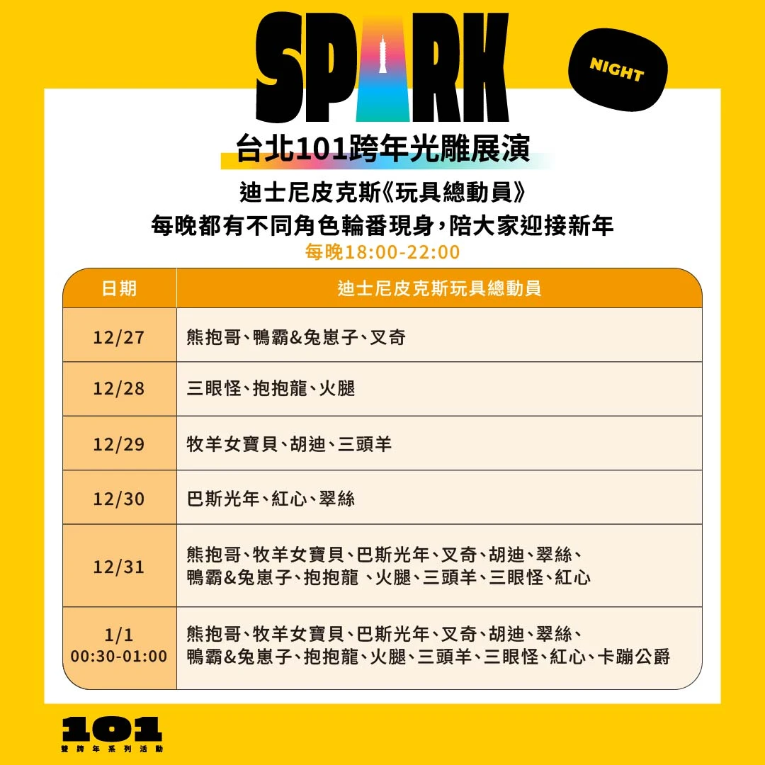 台北101今年跨年光雕展演提前至12月27日、每日晚間6點登場,三大主題包含迪士尼皮克斯《玩具總動員》倒數光雕展演、合作品牌限定光雕篇章、以及台北101「台灣隱形英雄」主題光雕秀,共同點亮跨年夜空。其中《玩具總動員》每天都有不同驚喜與角色亮相,12月27日由熊抱哥領軍,帶上活力滿點的鴨霸與兔崽子以及呆萌的叉奇(Forky),揭開倒數四天的序幕。