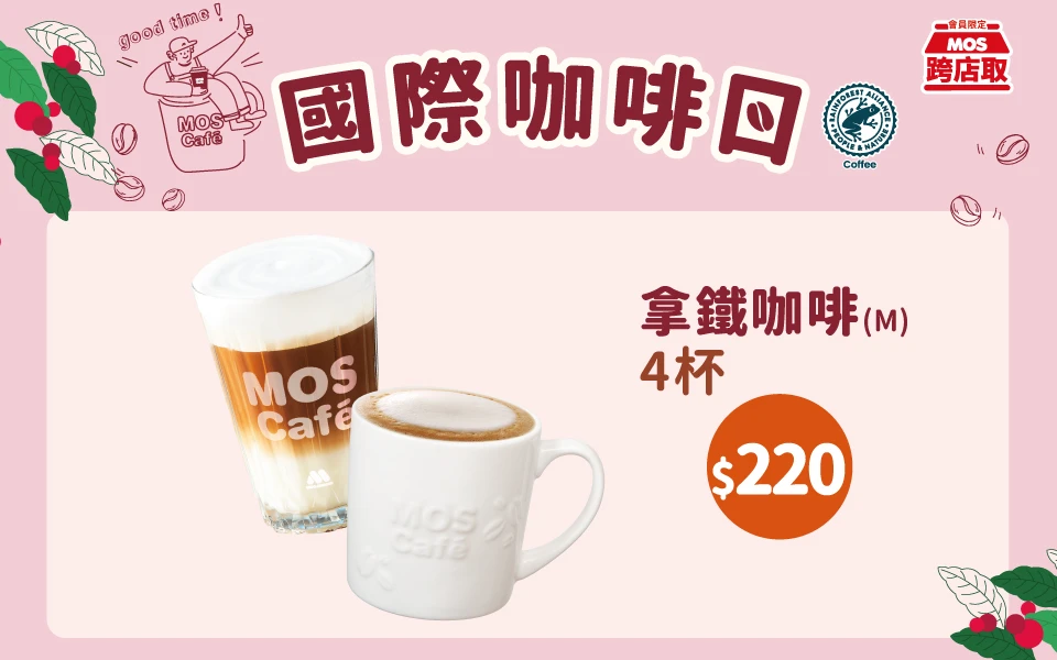10月4日至10月15日期間,咖啡優惠再加碼,「大杯摩斯咖啡與經典奶茶任選2杯優惠70元」,還有「冰橙咖啡第2杯10元,兩杯85元」。MOS Order App跨店取則推出大杯摩斯咖啡買6送4,中杯拿鐵4杯優惠價220元。