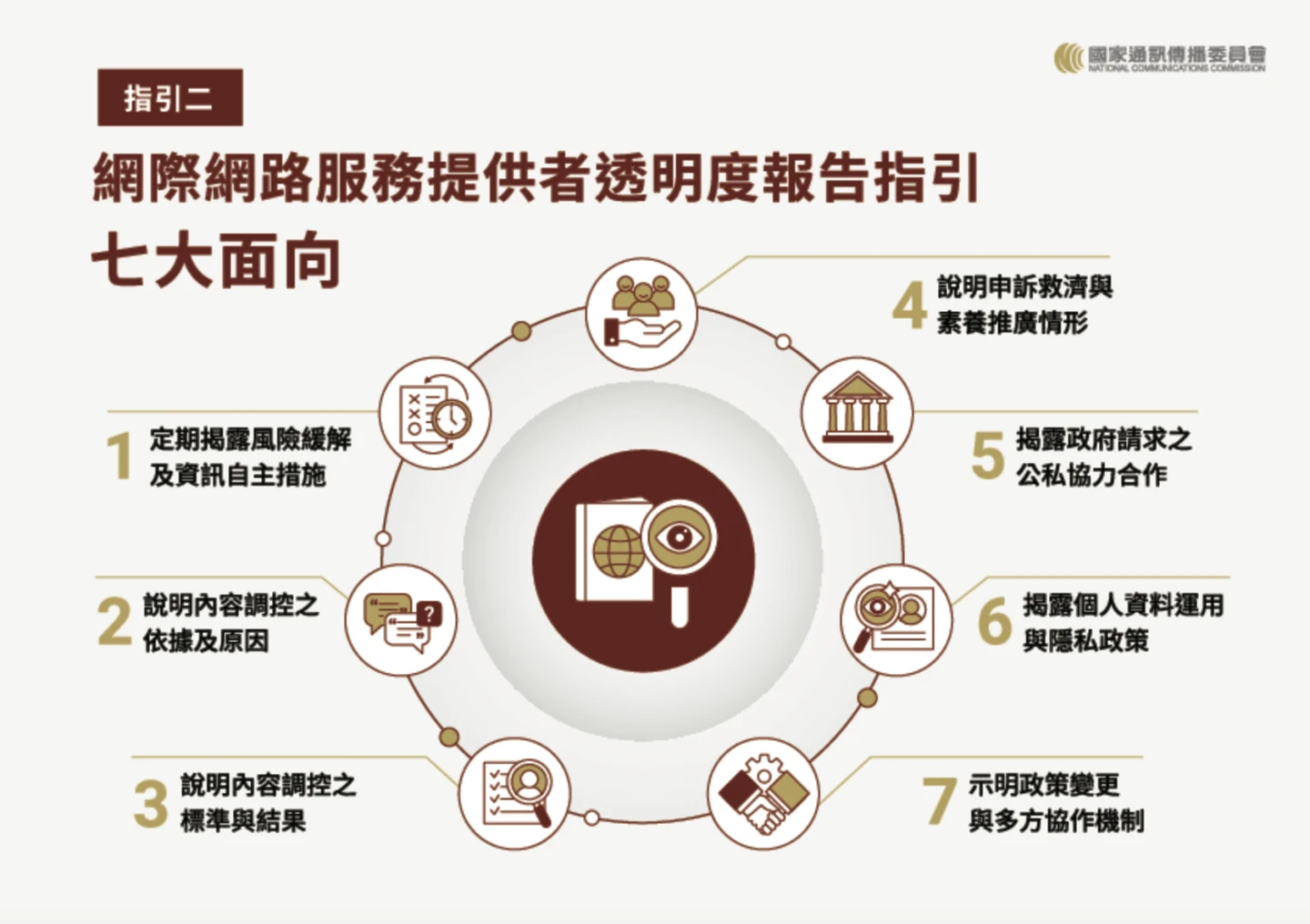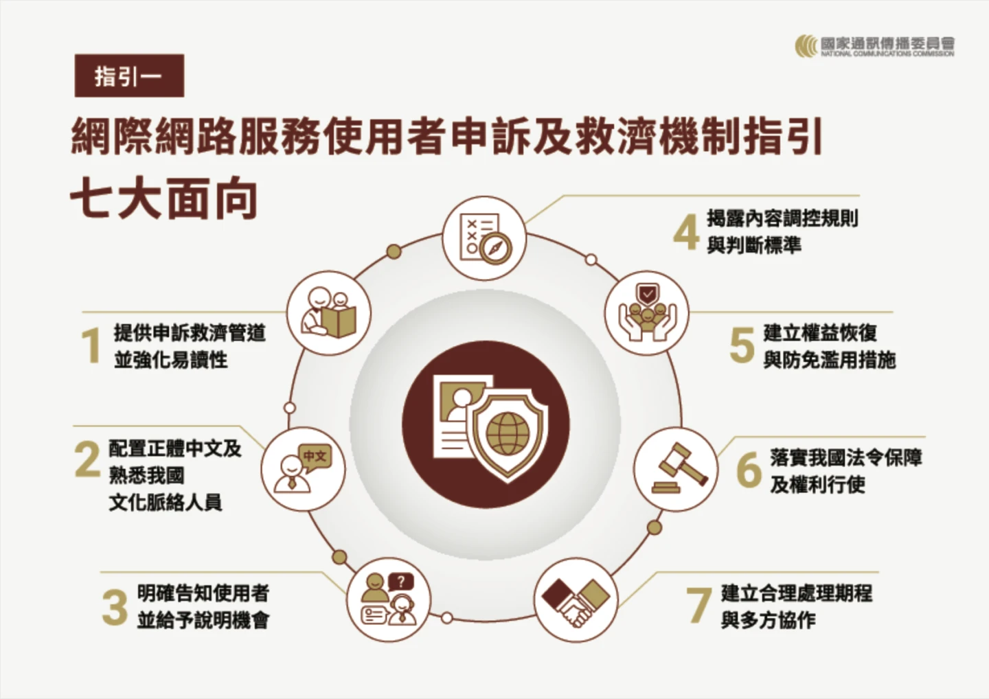 NCC說,申訴救濟指引著重於建構有效的申訴與救濟機制,並適度揭露審查標準,讓使用者明確知悉服務受限制的原因,確保使用者權益,受到充分保障;透明度指引則聚焦於內容調控、政府資料請求、隱私政策等資訊揭露,藉以回應社會期待。