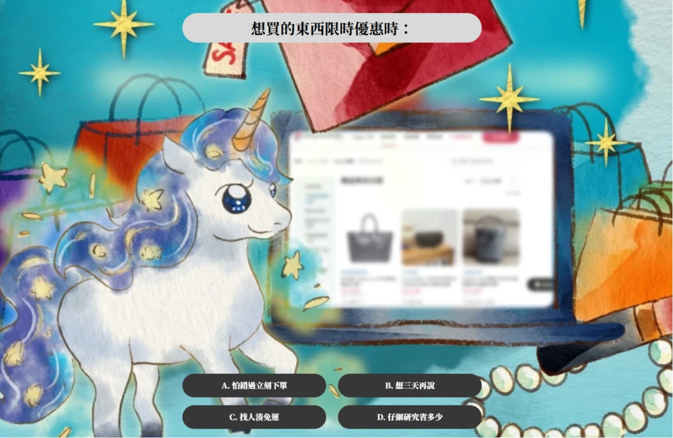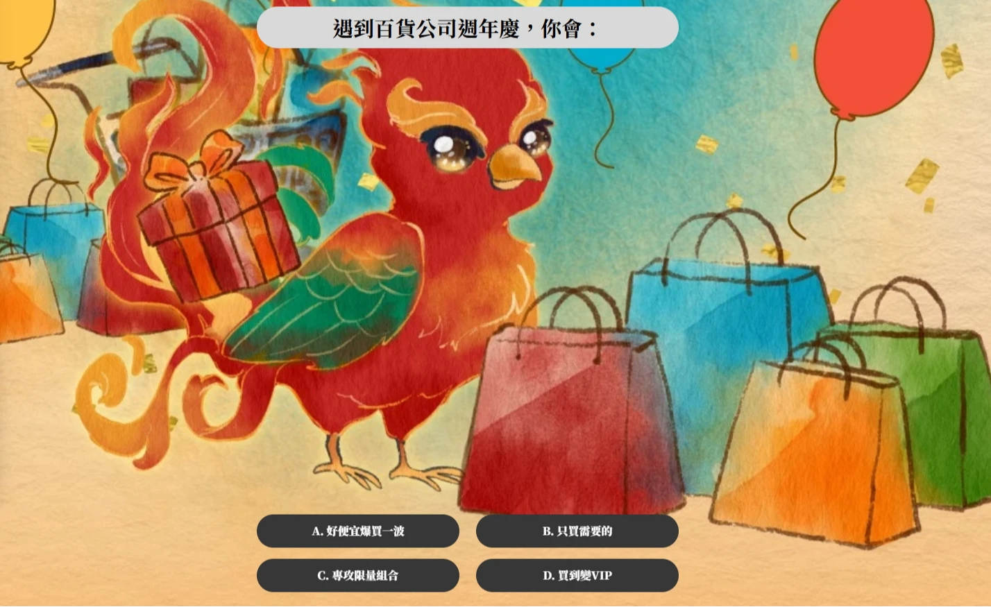 想召喚守護財庫的神獸,要先進行測驗回答5個問題,分析財庫特徵,每項問題都透露消費、聚餐及投資習慣,例如「遇到百貨公司週年慶」時,會專攻限量組合或爆買一波,還是只買需要的,或硬要湊足金額買到變VIP。