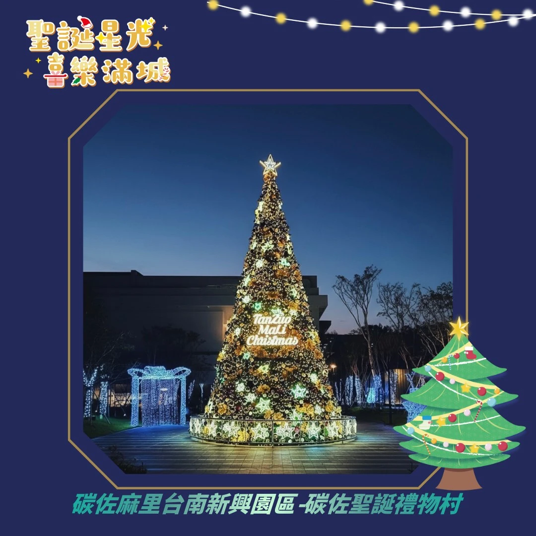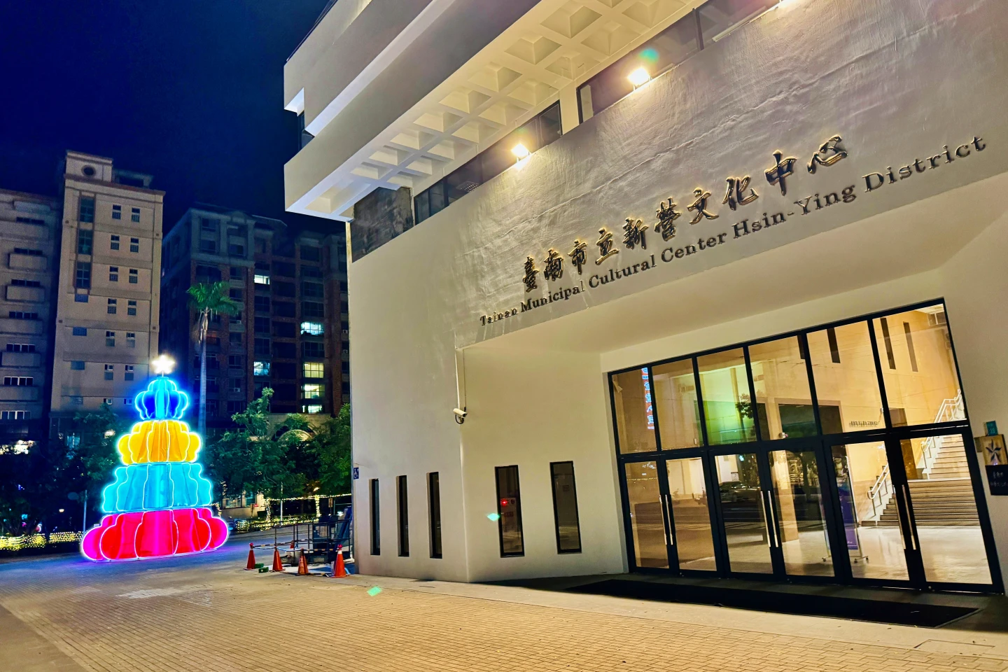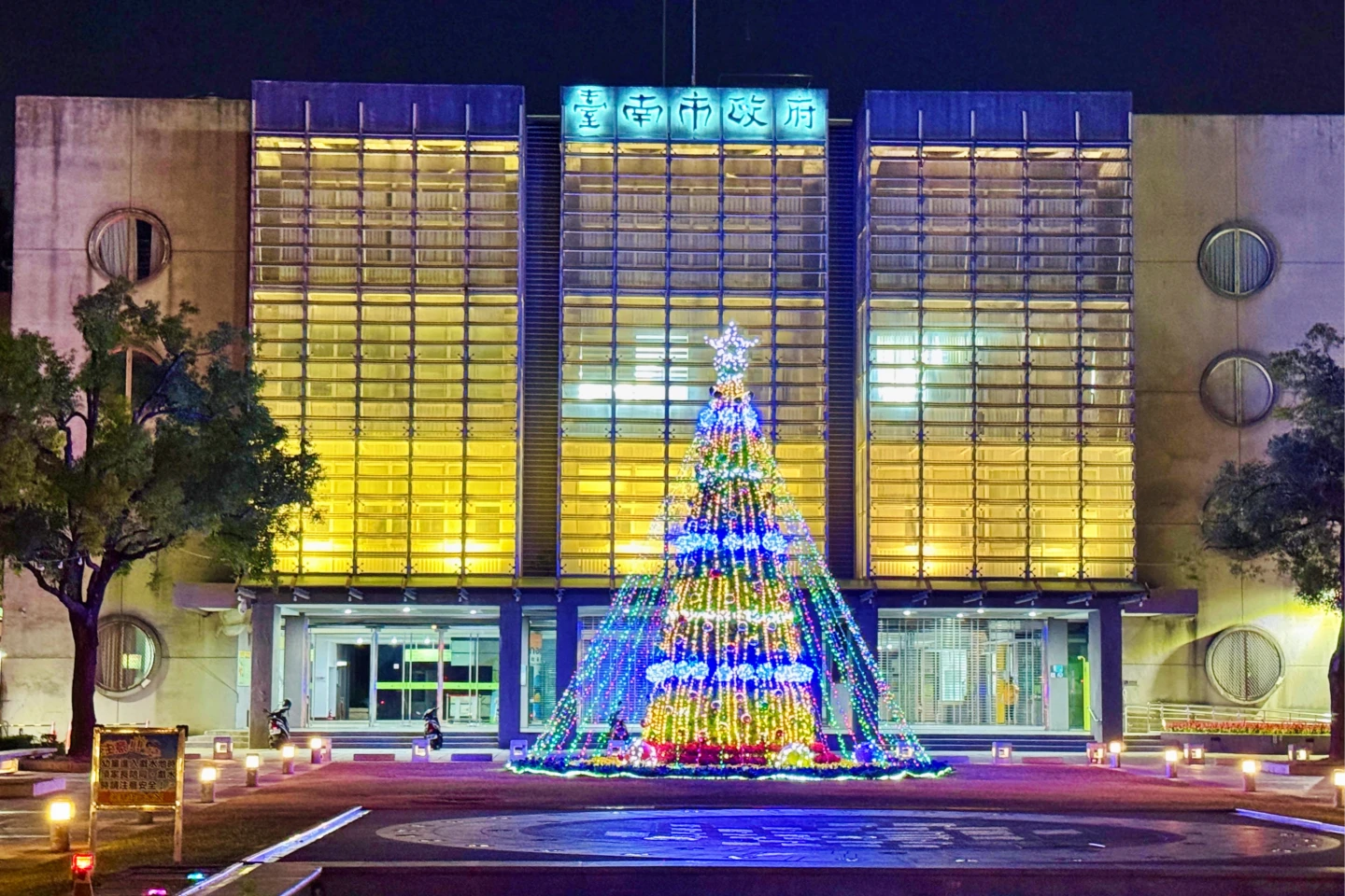 新營文化中心則推出「雲之曙光」耶誕樹,以繽紛雲朵轉化為飛行船意象,象徵著希望的航行,搭配周邊綠川廊帶、鐵道地景公園的燈飾,營造出濃厚的節慶氣息。