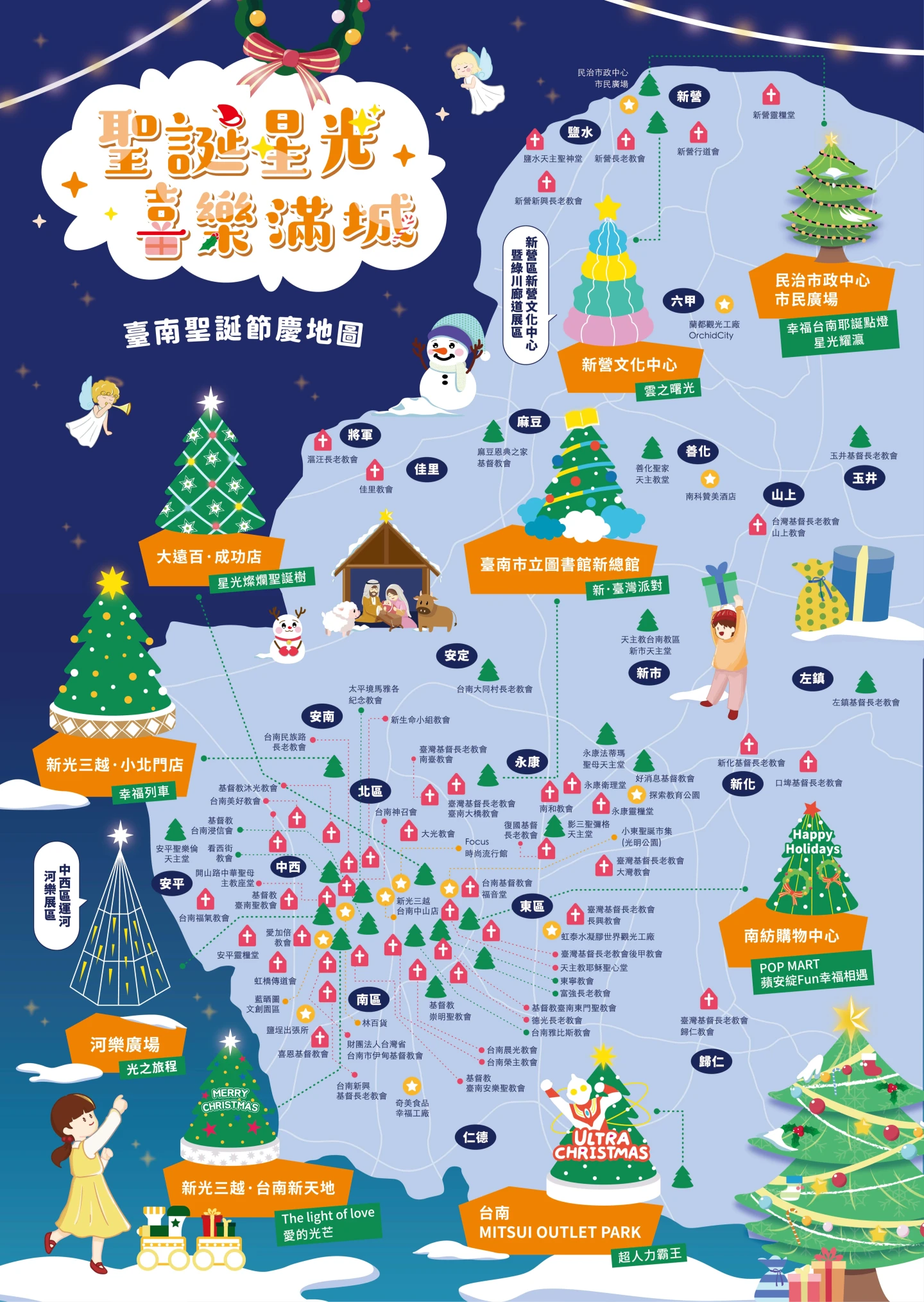 為了方便遊客規劃行程,觀旅局特別整合全市亮點,推出「2025臺南耶誕主題地圖」。民眾只需至台南旅遊網活動專頁點選連結,即可透過Google Map輕鬆查找各處燈區、報佳音活動及推薦遊程。